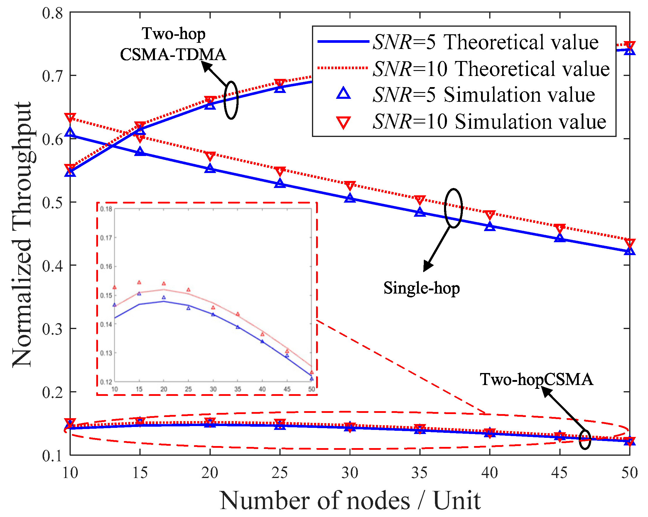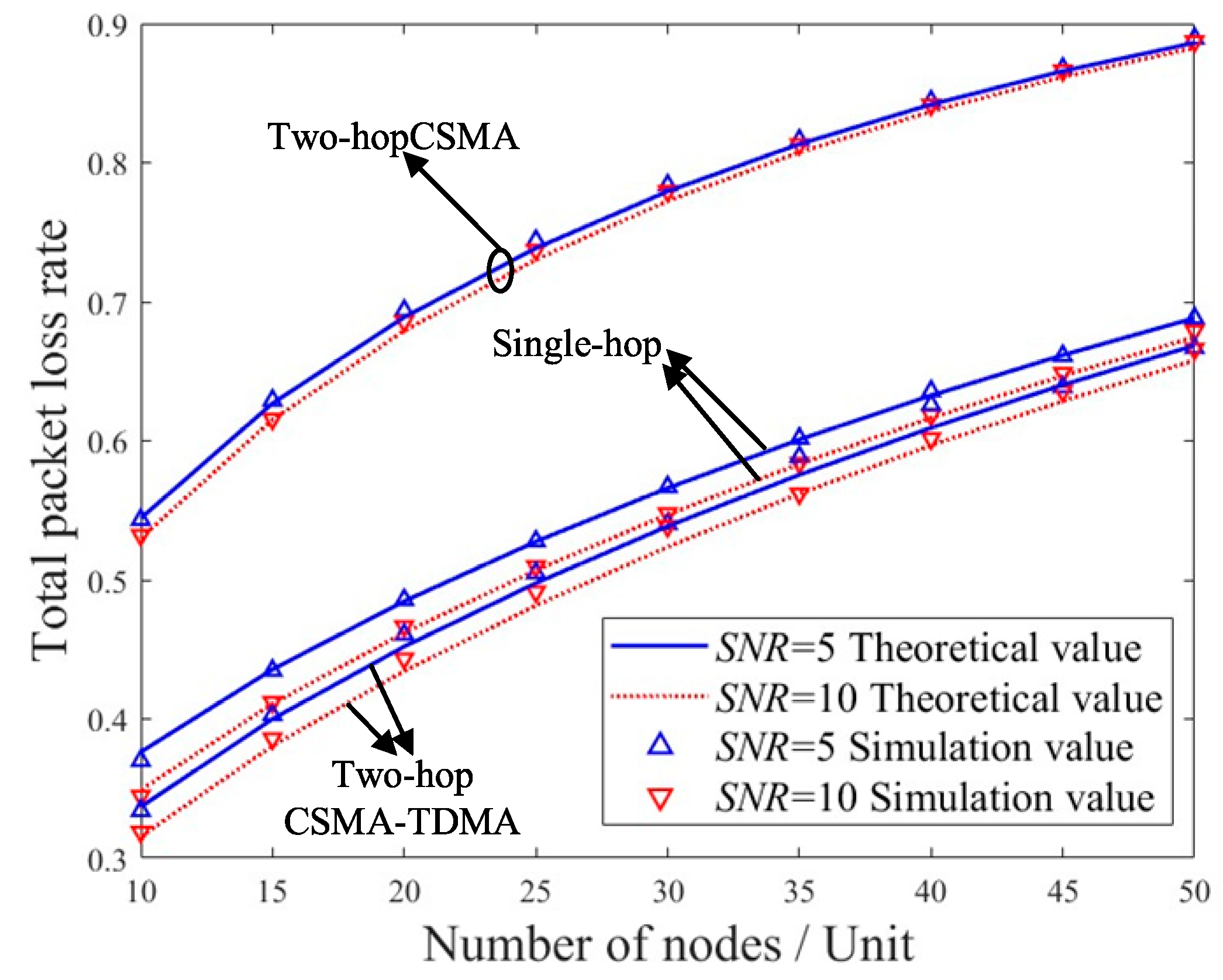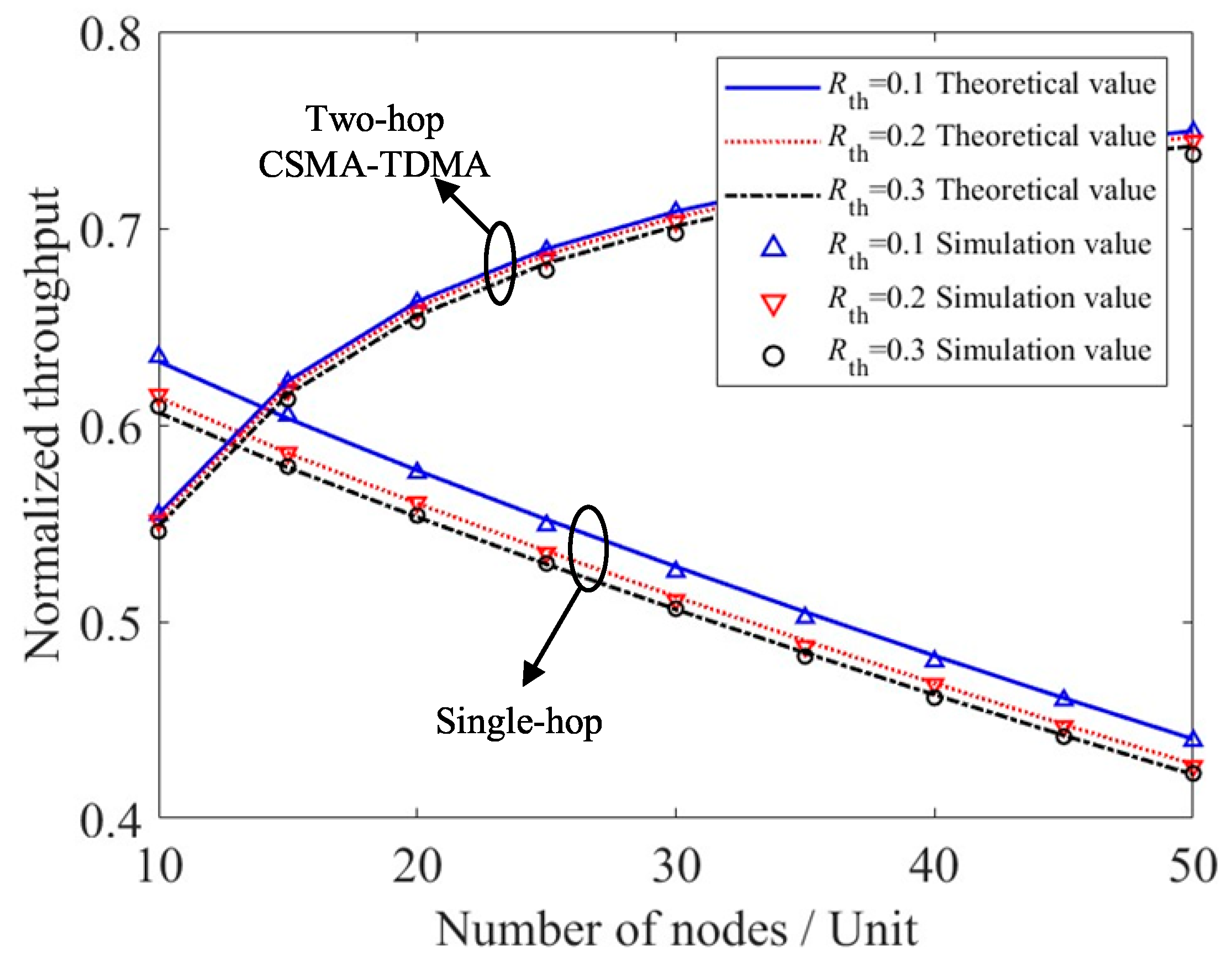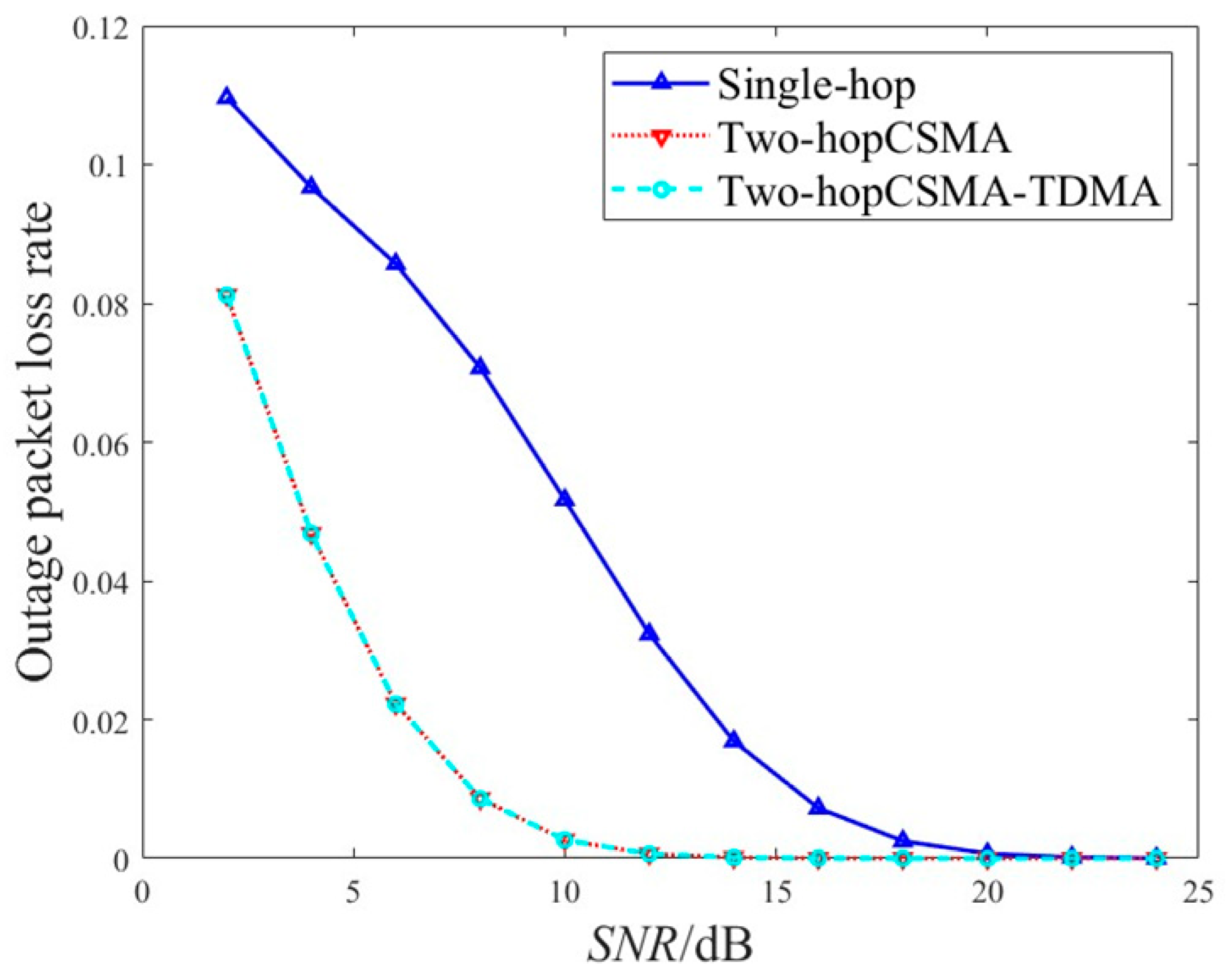 • The impact of imperfect channel transmission on the MAC layer is considered by jointly modeling the MAC-layer backoff procedure and physical-layer channel conditions. Analytical expressions for normalized throughput, packet loss rate, and transmission delay are derived, and extensive simulations are conducted to validate the accuracy and reliability of the theoretical model. Our results quantitatively demonstrate that the dual contention in a conventional two-hop CSMA scheme can lead to a collision probability exceeding 60% under moderate network loads, severely limiting throughput. The simulation results further compare the cross-layer performance of single-hop and two-hop schemes and reveal the effects of physical-layer and MAC-layer parameters on system behavior.