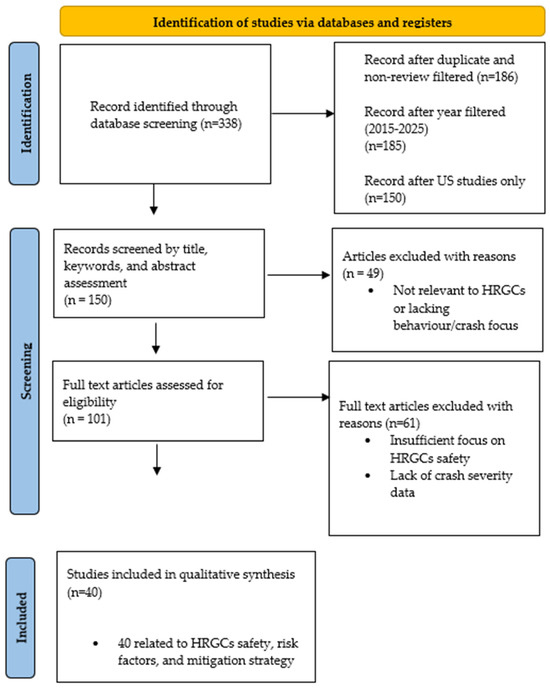 Figure 1. After removing duplicate and non-review articles, 186 unique articles remained. This set was then filtered by publication year (2015–2025), resulting in 185 review articles. Further refinement based on studies conducted in the United States reduced the number to 150. During screening by title, keywords, and abstract assessment, 49 articles were excluded for not being relevant to HRGCs or lacking sufficient focus on behavior- or crash-related aspects. This left 101 full-text articles to be assessed for eligibility. An additional 61 articles were excluded during full-text review for reasons such as insufficient focus on HRGC safety (