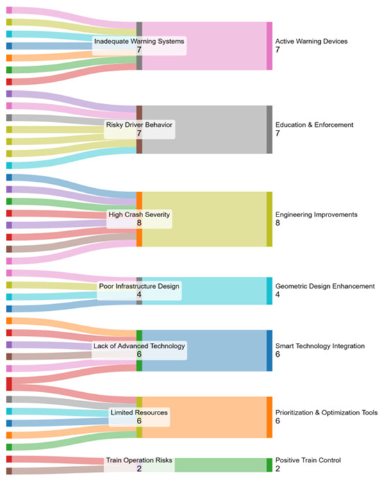 Figure 3 synthesizes 40 studies on HRGC safety using a Sankey diagram that illustrates the connections between research sources, identified risk factors, and proposed mitigation strategies. Among seven main risk categories, high crash severity (8 studies) and inadequate warning systems (7 studies) received the most research attention, collectively representing 37.5% of the reviewed literature.