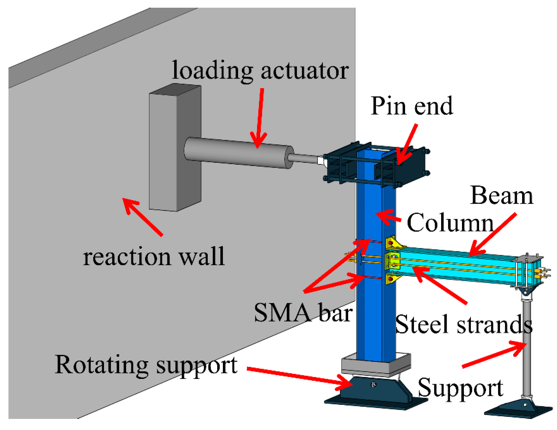 To validate the accuracy of the finite element (FE) modeling strategy, a supplementary full-scale experiment was conducted on a beam–column joint specimen. The test setup is illustrated in Figure 2. In this program, low-cycle reversed loading was applied at the column end, while the beam end was restrained, to reproduce the seismic demand on the joint region [34]. The specimen was fabricated with material properties and geometric dimensions consistent with those adopted in the FE model, ensuring the comparability between experimental and numerical responses. Two types of joints were investigated: a PSS-SMA joint equipped with both SMA bars and prestressed steel strands, and an SMA joint equipped with SMA bars only. The SMA material had an atomic composition of Ti–50.8 at.% Ni–49.2 at.%, and the austenite finish temperature of the as-hot-rolled bars was approximately 0 °C, indicating that the material remained in the austenitic phase at room temperature.