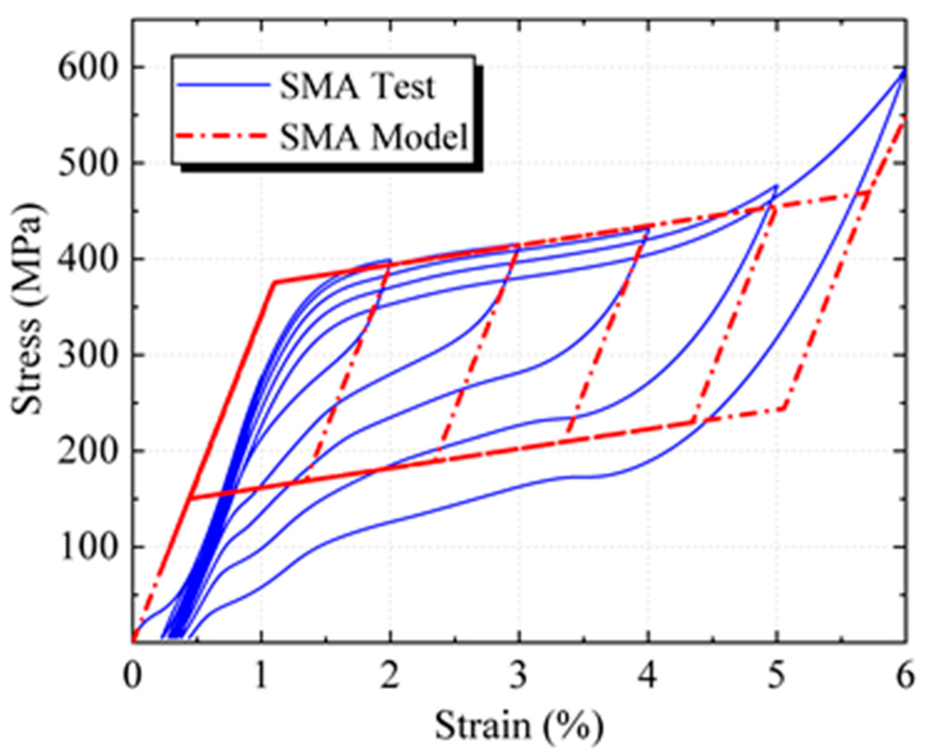 The most important constitutive law in the model is the self-centering material used to represent the SMA bars. This model can reproduce the flag-shaped hysteresis typical of superelastic SMAs. The stress–strain response is shown in Figure 6 [40].