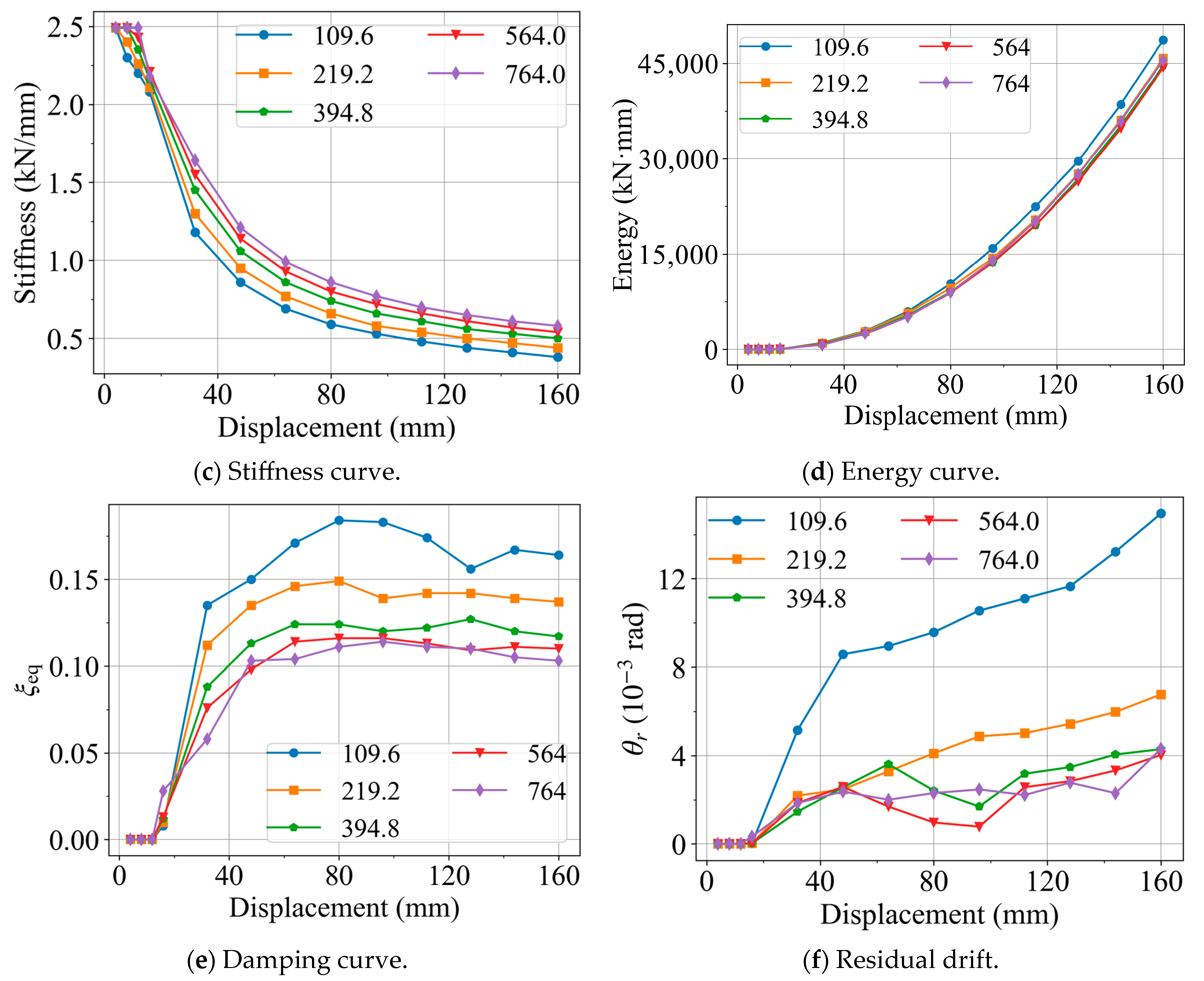 In hysteresis performance evaluation, secant stiffness is commonly used to represent the overall load-carrying capacity of a structure at a given displacement [32]. It is defined as the slope of the line connecting the origin and a specific point on the load–displacement curve:
