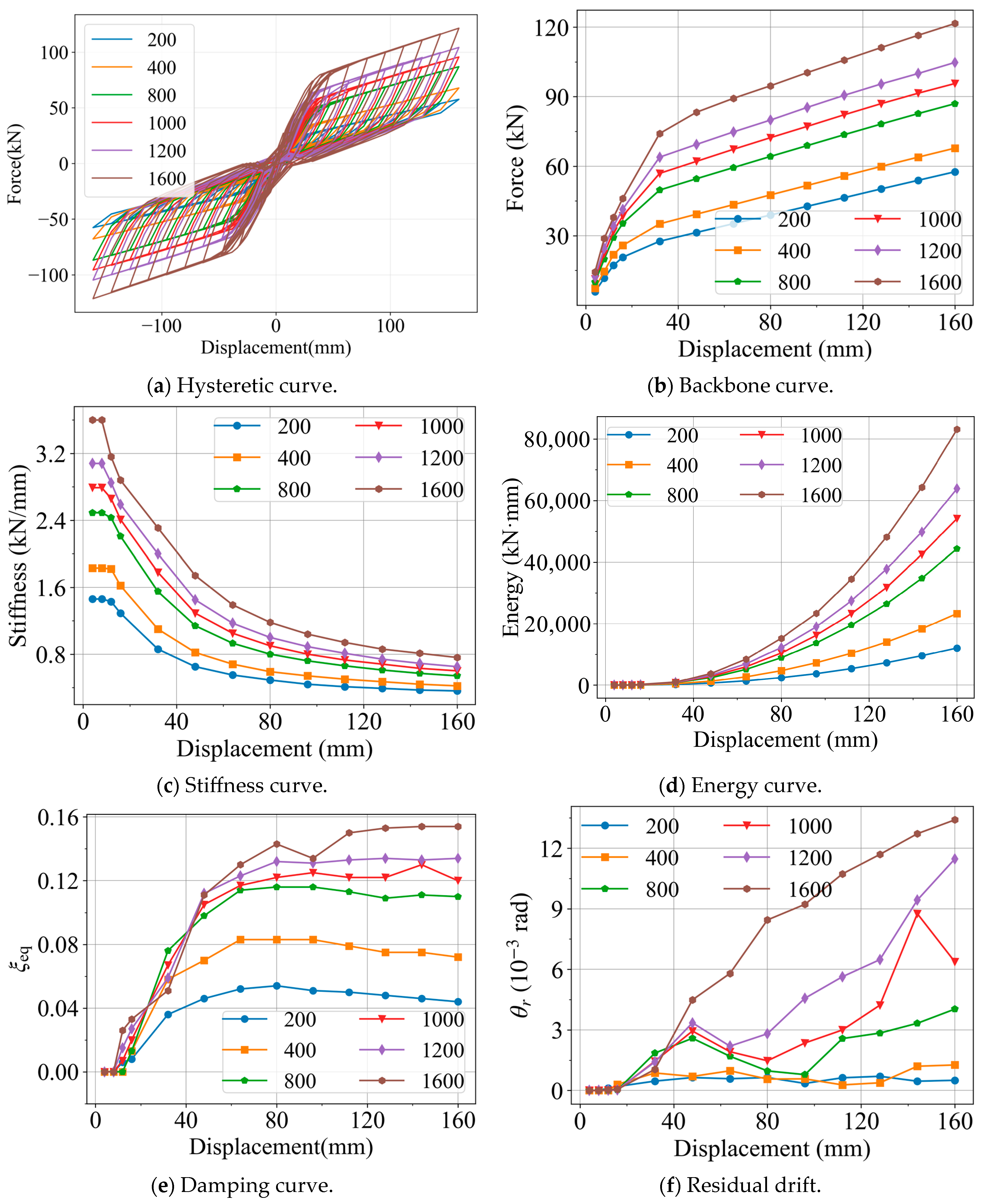 The prestressing level of the steel strands in the baseline joint was set to 700 MPa. To further investigate the influence of strand prestressing on the joint performance, the prestressing force was varied to 400, 1000, 1300, and 1600 MPa. The corresponding analytical results are presented in Figure 13, where the hysteretic curve is illustrated in Figure 13a.