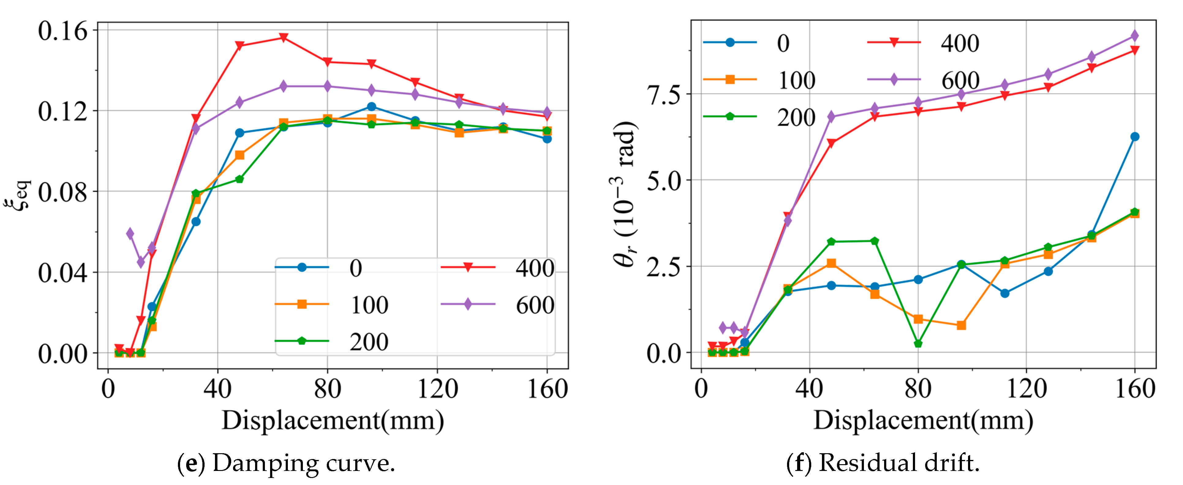 From Figure 15d,e, it can be observed that higher initial stress enhances the total energy dissipation capacity of the joint and provides greater equivalent viscous damping at small displacement levels. Nevertheless, the results in Figure 15f also reveal that this improvement in energy dissipation comes at the expense of increased residual deformation of the joint.