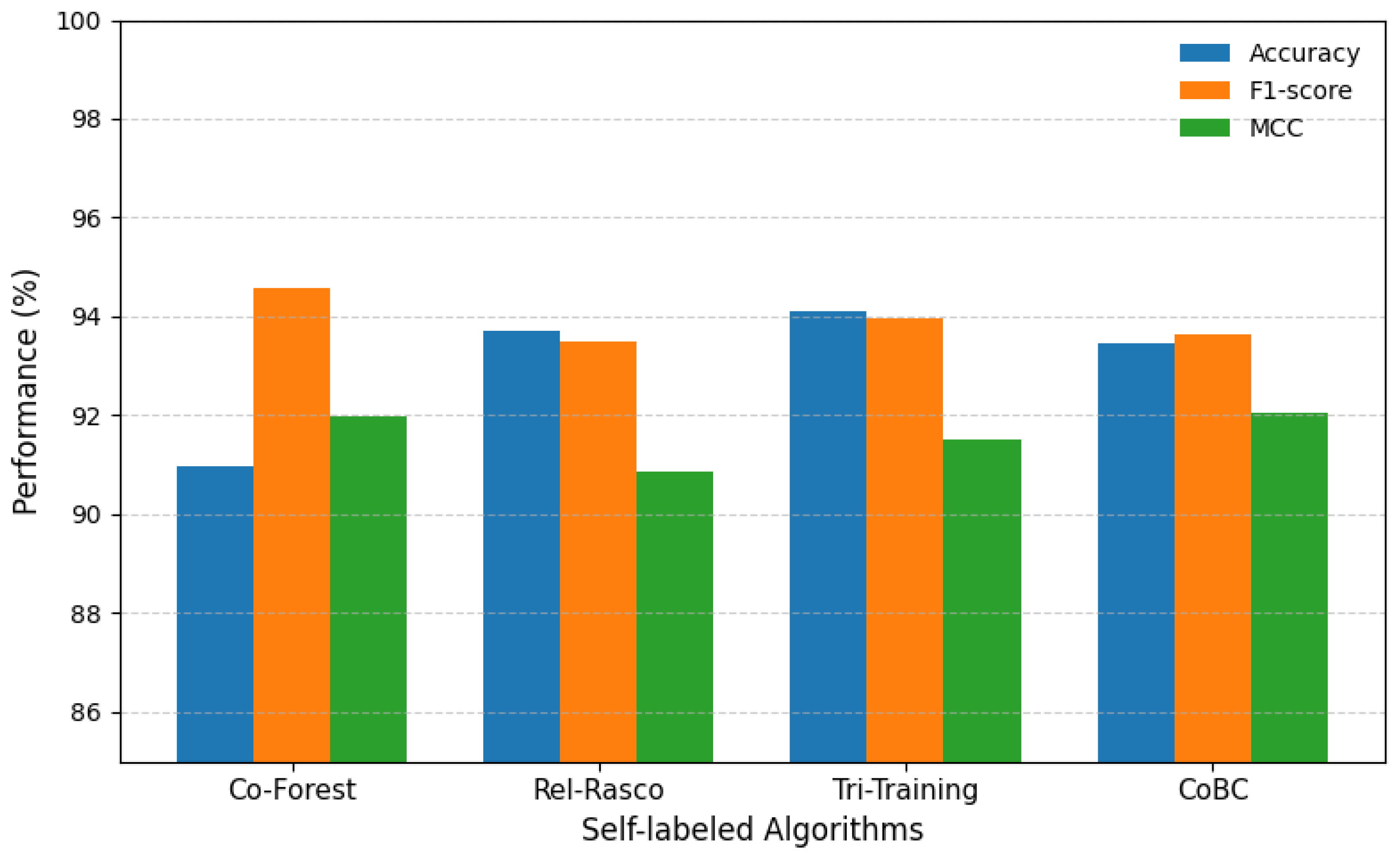 - Tri-Training and CoBC demonstrated exceptional adaptability to scarce labeled conditions, validating the effectiveness of consensus-based and committee-driven labeling strategies in minimizing error propagation.