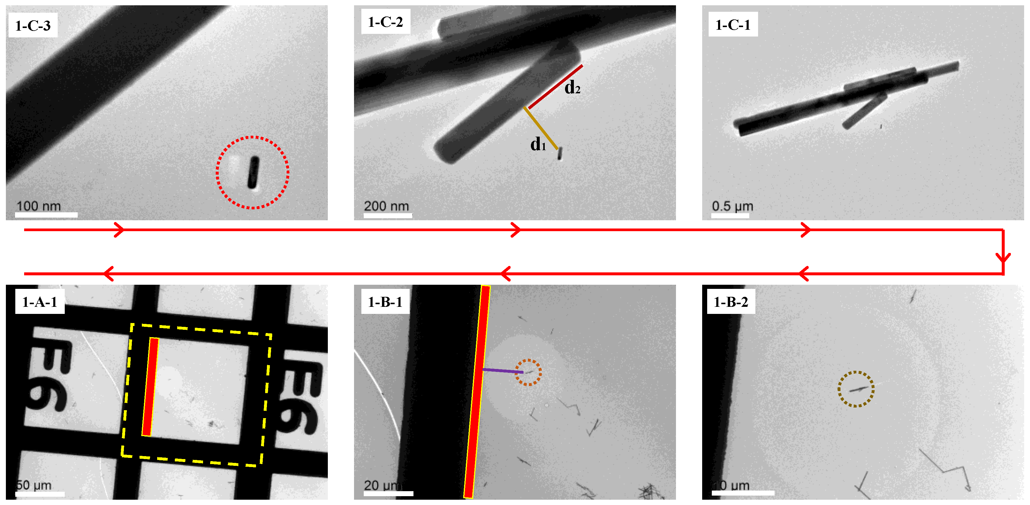Figure 3(1-C-2,1-C-1) are the TEM images of the same point with a larger field of view. The spatial relationship between the target Au nanorod and the inert markers are also labeled in