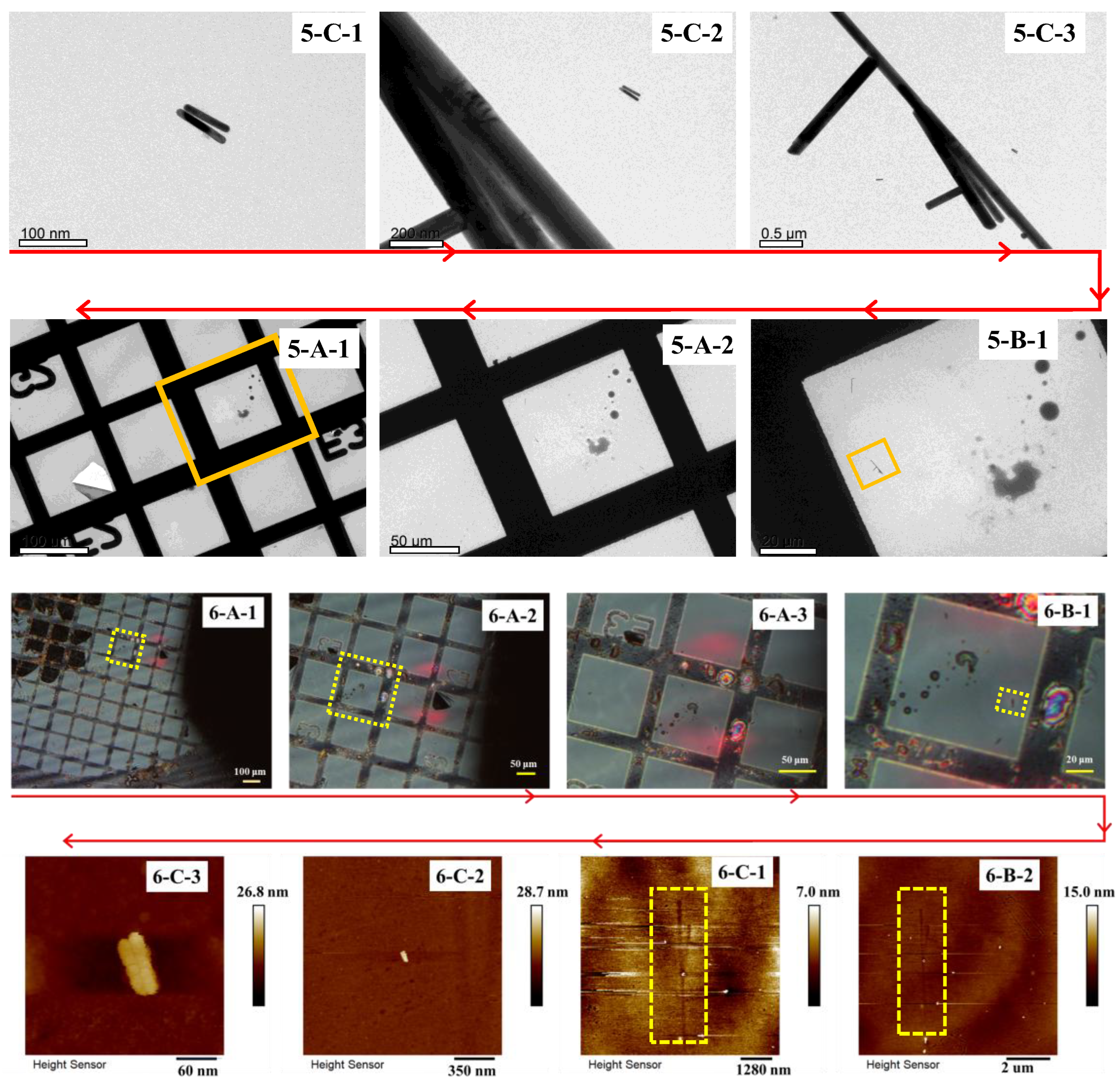 Due to the different principles of TEM and AFM, the structure of the instruments and the design of the sample stages are completely different. At present, there are few reports on the methods and results of micro-area correlation imaging between TEM and AFM. However, some recent studies have demonstrated the potential for correlated AFM-TEM imaging, such as the application to lipid nanoparticles, where a step-by-step procedure was provided to obtain pairs of correlated AFM-TEM images. Additionally, other research has shown a complementary structural analysis using AFM and TEM for surface functionalization.