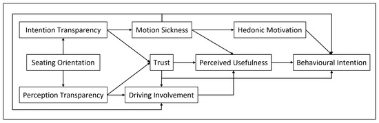 Intention transparency–perception transparency, as relevant traffic objects might act as explanations for certain driving maneuvers [75]; trust–driving involvement, as low-trust passengers might reassure themselves of the system’s capabilities by monitoring the driving activity [76]; trust–motion sickness, as severe motion sickness might lead to a negative perception of the AV’s driving style and, thus, to a decrease in trust [77]; driving involvement–intention transparency, as passengers that do not receive information about driving maneuvers from the AV might be inclined to actively look for this information themselves [78]; and hedonic motivation–trust, as low trust can lead to aversive emotions [79], diminishing pleasure during automated journeys [80].