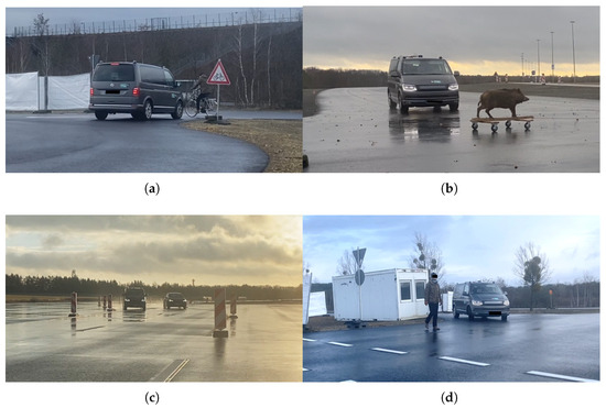 The four traffic scenarios that occurred during the journeys. (a) Crossing cyclist. (b) Crossing boar. (c) Overtaking vehicle on a highway construction site. (d) Crossing pedestrian.