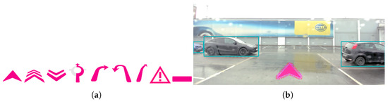 Previous research has frequently examined augmented reality representations for vehicle transparency, which emerged as a preferred representation by most participants [62,64]. To account for this preference, the perspective of the navigation symbols was adjusted by two 8-degree rotations to create the illusion of the symbols lying on the ground and the vehicle driving over them (Figure 5). The intention transparency manipulation was integrated into the Python code, allowing it to function independently and in conjunction with the perception transparency manipulation.