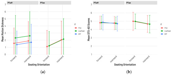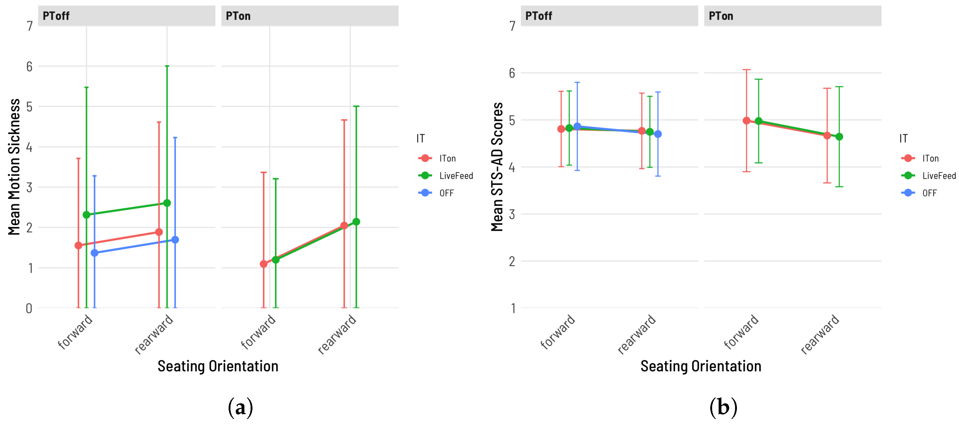 Statistical analysis was conducted using R version 4.3.1 (The R Foundation, Vienna, Austria). A mixed model analysis of variance was applied to assess the effects of seating orientation (forward, rearward), intention transparency (IT: no image vs. camera feed vs. camera feed + arrows), and perception transparency (PT: bounding boxes vs. no bounding boxes) on measured intention and perception transparency, motion sickness, trust, driving involvement, hedonic motivation, and perceived usefulness. Each outcome was analyzed separately with fixed effects for the factorial design (SeatingOrientation × IT × PT) and random intercepts for subjects to account for repeated measures [69]. Due to the nested data structure where PT “ON” combined with IT “OFF” effectively functioned as “OFF”, causing unequal group sizes, a mixed model was preferred over classical ANOVA, which assumes balanced data [70].