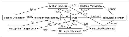 The SEM summary is shown in Table 2. The model showed a good fit (CFI = 0.969, TLI = 0.916, RMSEA = 0.06, SRMR = 0.05, (11) = 18.11, p = 0.079, all scaled and robust versions calculated under the MLR estimator). As expected, seating orientation predicted intention transparency to a significant degree. However, the same was not true for perception transparency. Intention transparency predicted neither trust nor motion sickness significantly; however, it did predict driving involvement. Perception transparency predicted trust but not driving involvement. Motion sickness predicted driving involvement, hedonic motivation, and trust but not perceived usefulness. Trust predicted perceived usefulness, hedonic motivation, and driving involvement.