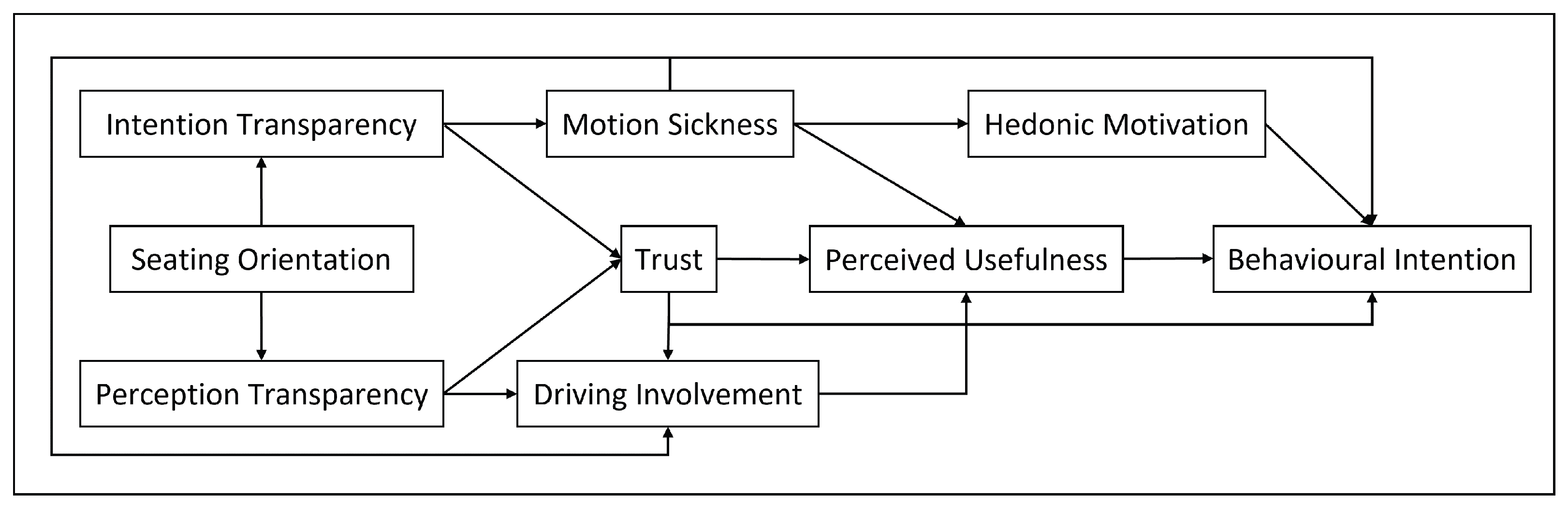 We further expect motion sickness to predict perceived usefulness, as it has been shown to influence the choice of NDRT during autonomous rides [40]. This is likely due to differences in motion sickness severity elicited by different NDRTs [41]. Specifically, looking outside leads to significantly less motion sickness than conducting a visual NDRT [42,43,44]. Thus, motion sickness will decrease the willingness to pursue useful NDRTs. Even in passengers continuing their NDRT while experiencing motion sickness, NDRT performance will suffer [45,46].