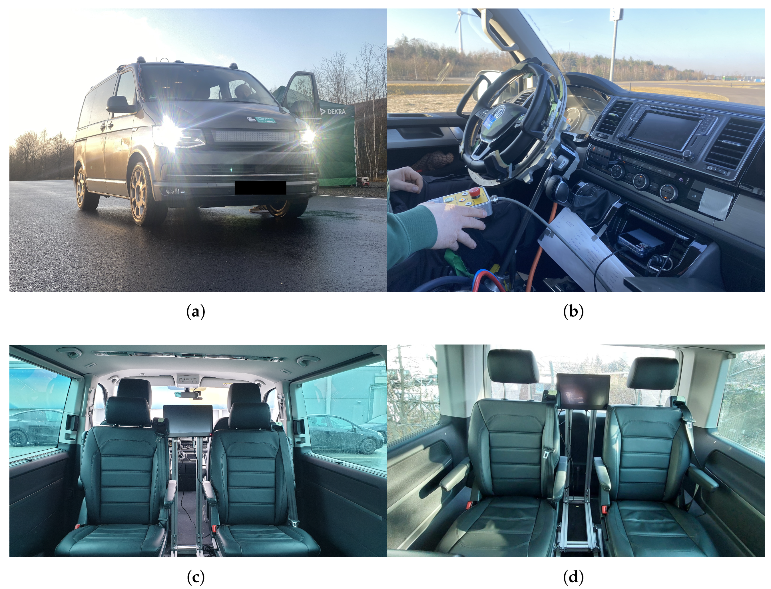 A Volkswagen T6 Multivan (2-L Diesel engine, 200 HP, automatic dual clutch transmission) served as the test vehicle (Figure 2). It featured three rows of seats, with the seats in the middle row being rotated by 180 degrees, causing the seats of the second and third rows to face each other. Participants sat in the second and third row of the seats, which were mounted 60 cm apart, and the backrest was set at an 100° angle relative to the seating surface. LC-displays (Faytech n.d., Witzenhausen, Germany) measuring 13 inches with a resolution of 1920 × 1080 pixels were mounted between the seats of the second and third row, respectively. They were positioned at a height of 85.5 cm from the vehicle floor (lower edge) and 7 cm behind the seats. Each display was visible to participants sitting in the opposite seating row (Figure 2). Vomit bags were provided within easy reach. To enhance the impression of an AV, a magnet board stating ‘autonomous vehicle’ was placed on each side of the vehicle. Additionally, four dummy cameras were attached to the vehicle roof.