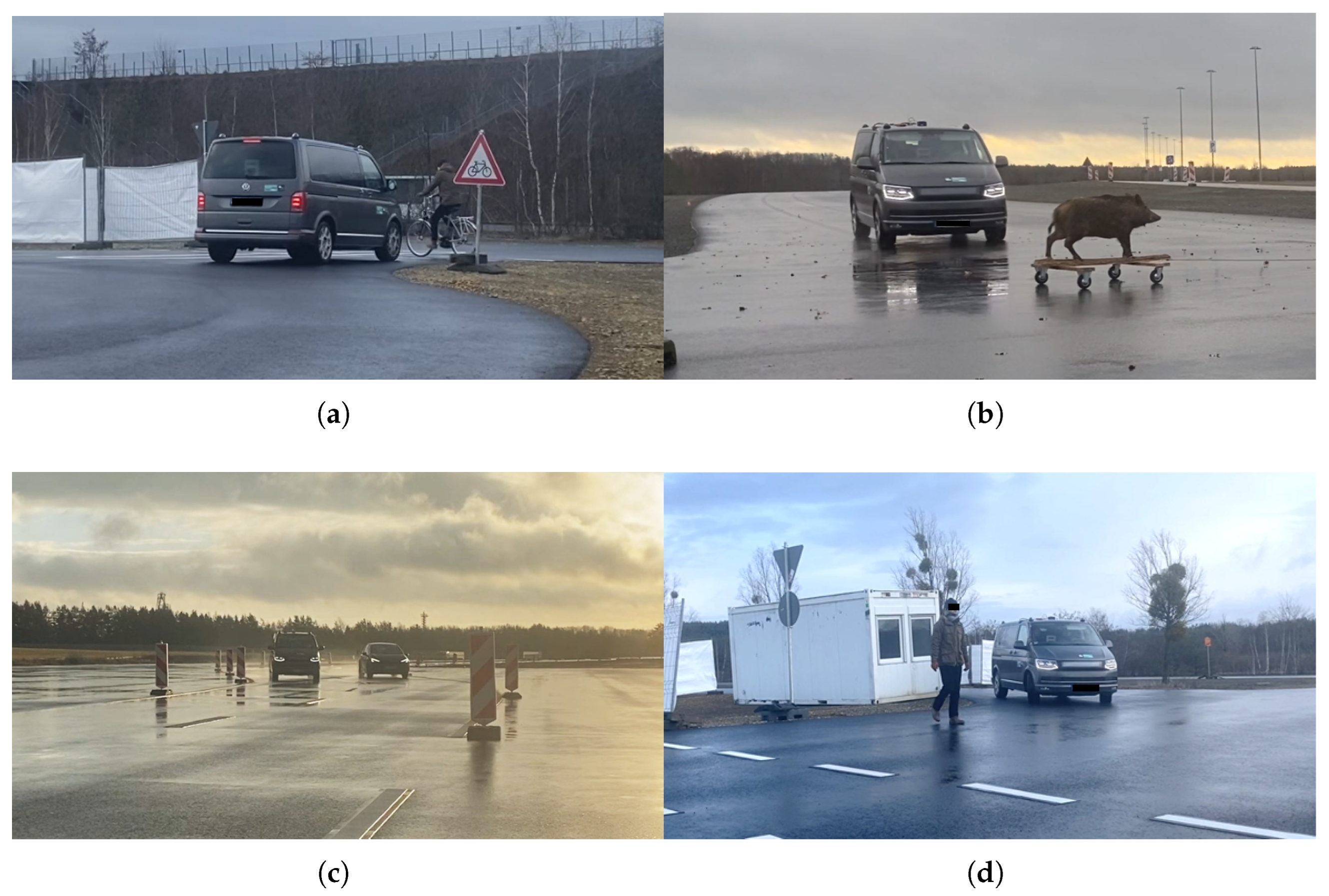 Figure 3. The four traffic scenarios that occurred during the journeys. (a) Crossing cyclist. (b) Crossing boar. (c) Overtaking vehicle on a highway construction site. (d) Crossing pedestrian.