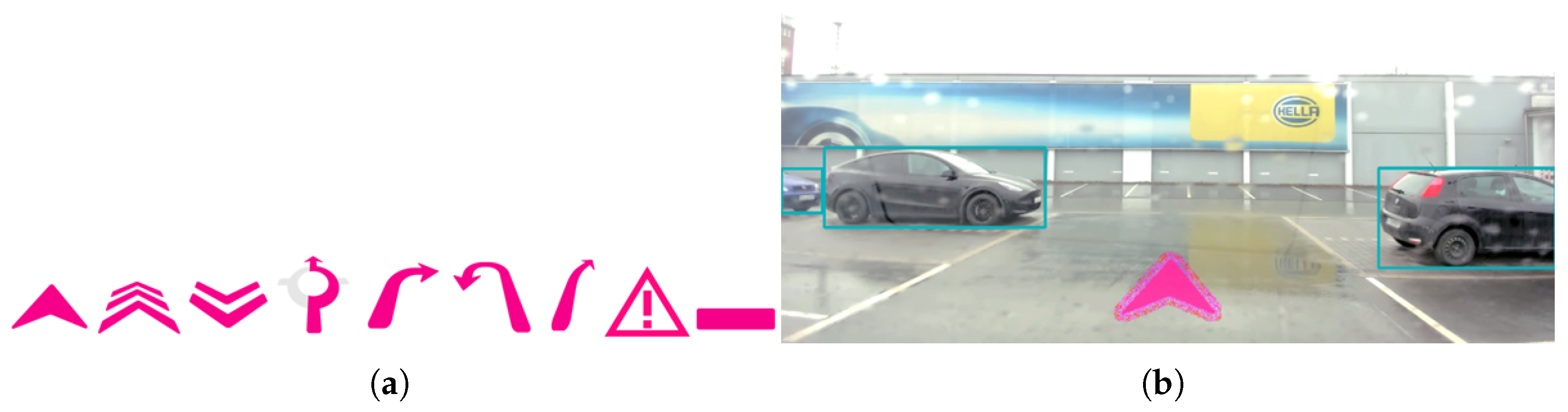 All symbols featured the same curve radius, perspective degree, color, and stroke weight to account for the Gestalt principle of similarity. Additionally, proximity and similarity were taken into account in the design of the acceleration and braking navigation symbols. The choice of presentation colors was guided by the figure–ground Gestalt principle, incorporating insights from Künzer [65] regarding the perception of danger or safety based on coloration. Consequently, colors such as green or red were omitted, as they could erroneously imply safe or unsafe maneuvers of the experimental vehicle, potentially contradicting the actual situation (e.g., in the event of an emergency brake). Moreover, these colors are commonly interpreted as ‘stop’ and ‘go’ within the automotive context [66]. Cyan, recommended for external AV communication as a neutral color [66,67], as well as purple were deemed unsuitable in the present context, as it would not sufficiently contrast with the tarmac. Instead, magenta was chosen as it showed a good figure–ground effect while still conveying a neutral vehicle state.