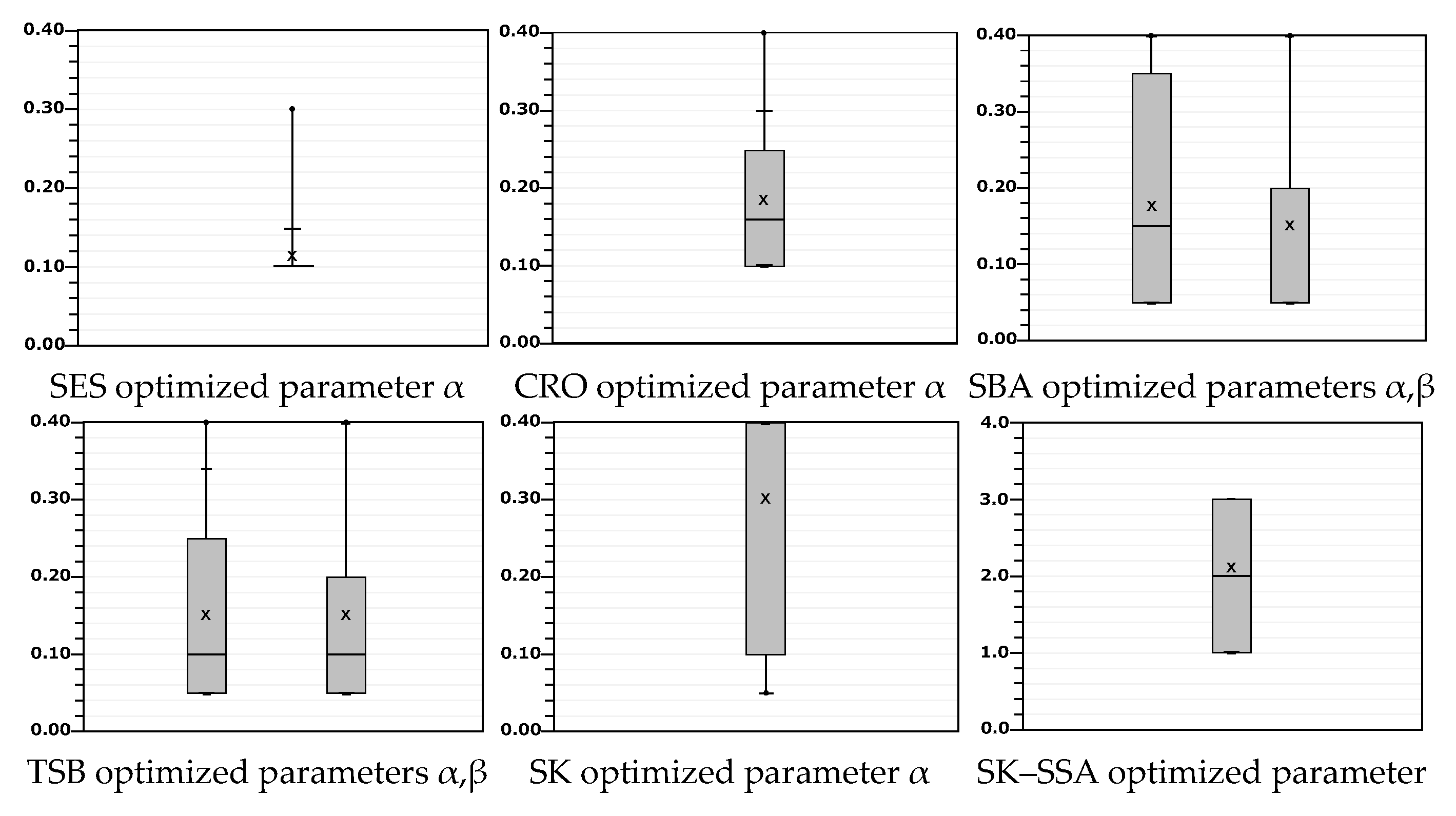 | SMA, SES, CRO, SBA, TSB, SK, mSBA, mTSB, SK–SSA | 0.539 | 0.689 | 0.715 | 0.395 | 0.529 | 0.612 | 0.702 | 1.481 | 2.259 |