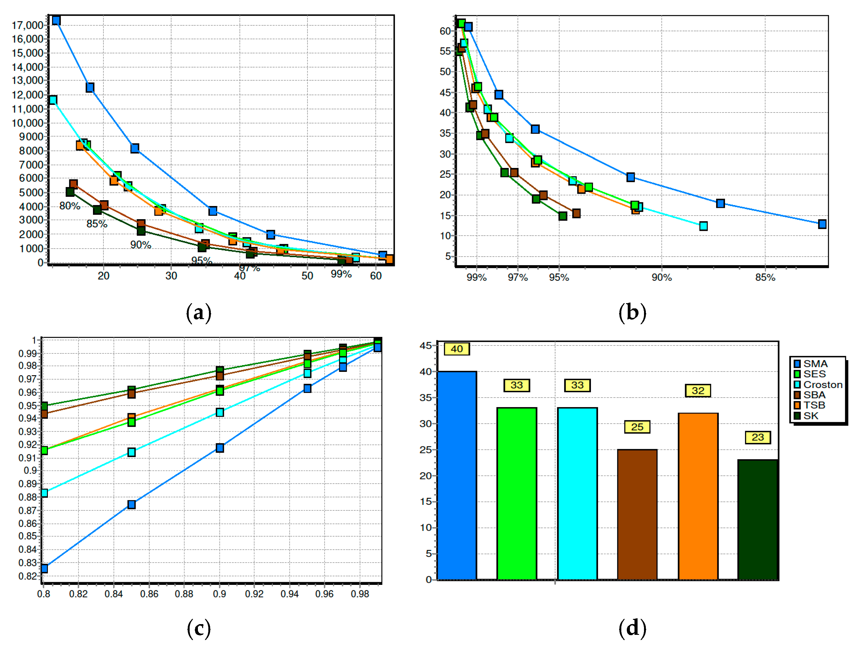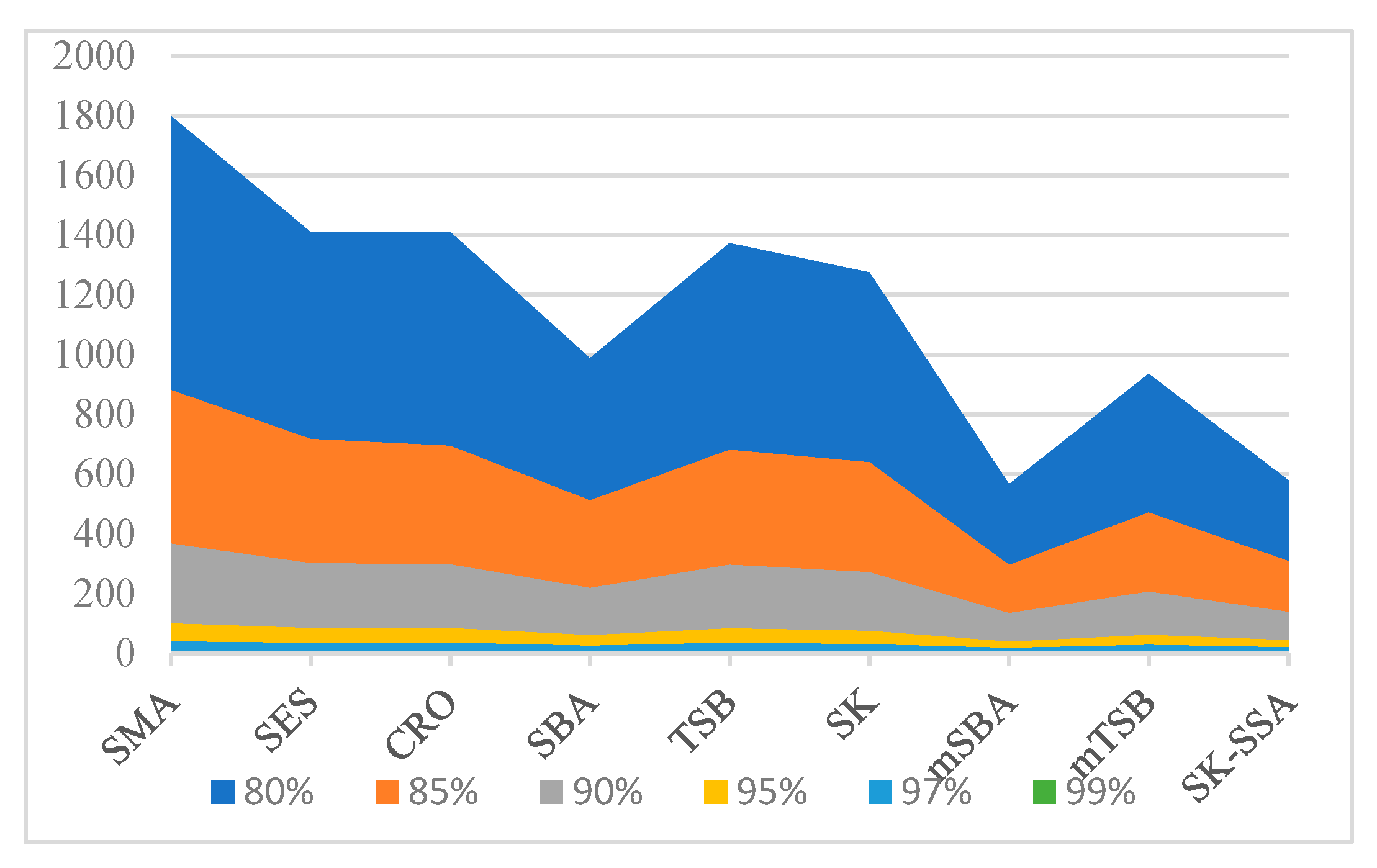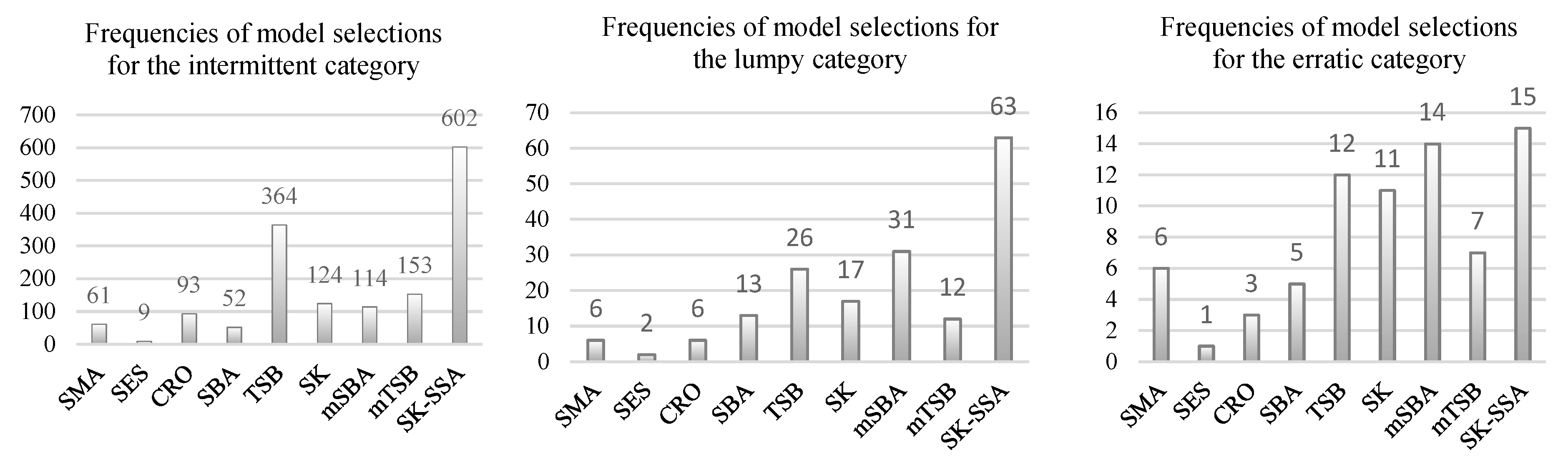 | Intermittent SKUs sSPEC | SMA | SES | CRO | SBA | TSB | SK | mSBA | mTSB | SK–SSA | Optimal |
