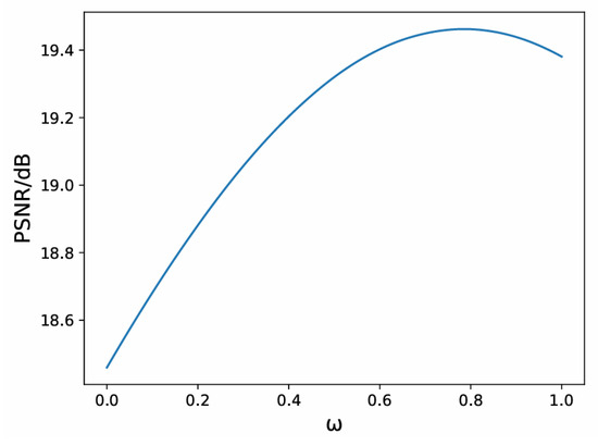 where ω ∈ [0, 1] is the weight of the time domain denoised matrix, TN is the denoised matrix in the time domain and FN is the denoised matrix in the frequency domain. In the experiment, we discovered that the influence of ω on the peak signal-to-noise ratio (PSNR) of the final result is a convex function, as shown in Figure 2.