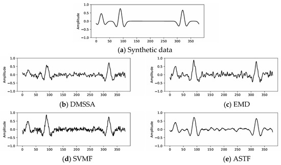 Synthetic example: (a) is clean data, (b) is the denoised result of DMSSA, (c) is the denoised result of EMD, (d) is the denoised result of SVMF and (e) is the denoised result of ASTF.