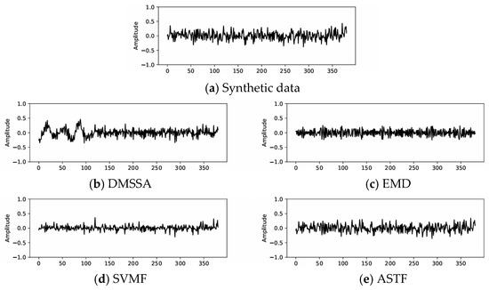 Synthetic example: (a) is the added Gaussian noise, (b) is the noise suppressed by DMSSA, (c) is the noise suppressed by EMD, (d) is the noise suppressed by SVMF and (e) is the noise suppressed by ASTF.