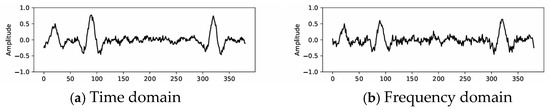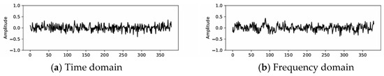 Figure 6 shows the denoised results in the time domain and frequency domain before fusion. Figure 7 shows the noise suppressed in the time domain and frequency domain, respectively. It can be seen from Figure 6 and Figure 7 that both time domain and frequency domain processing can suppress noise. The effective signal processed in the time domain is not smooth enough. Part of the effective signal is lost when processed in the frequency domain. The denoised results of the two domains are fused according to a certain weight, which can well take into account the preservation of the signal and the suppression of the noise.