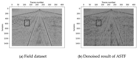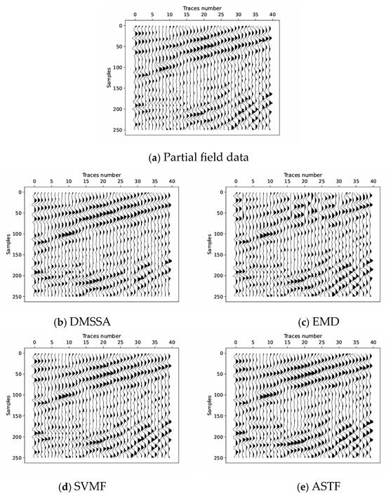 This subsection introduces the comparison between ASTF and three effective methods (including DMSSA, EMD and SVMF) on a field dataset. Table 1 and Figure 8a show the information of the dataset. The seismic events are damaged to a certain extent below the first arrival. Figure 8b shows the denoised result of ASTF. It can be seen from this that ASTF makes the seismic event clear and it effectively suppresses the noise.