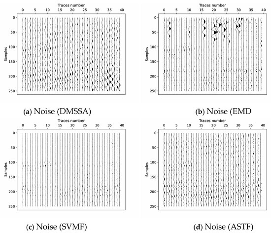 (a) Noise suppressed by DMSSA, (b) noise suppressed by EMD, (c) noise suppressed by SVMF and (d) noise suppressed by ASTF.
