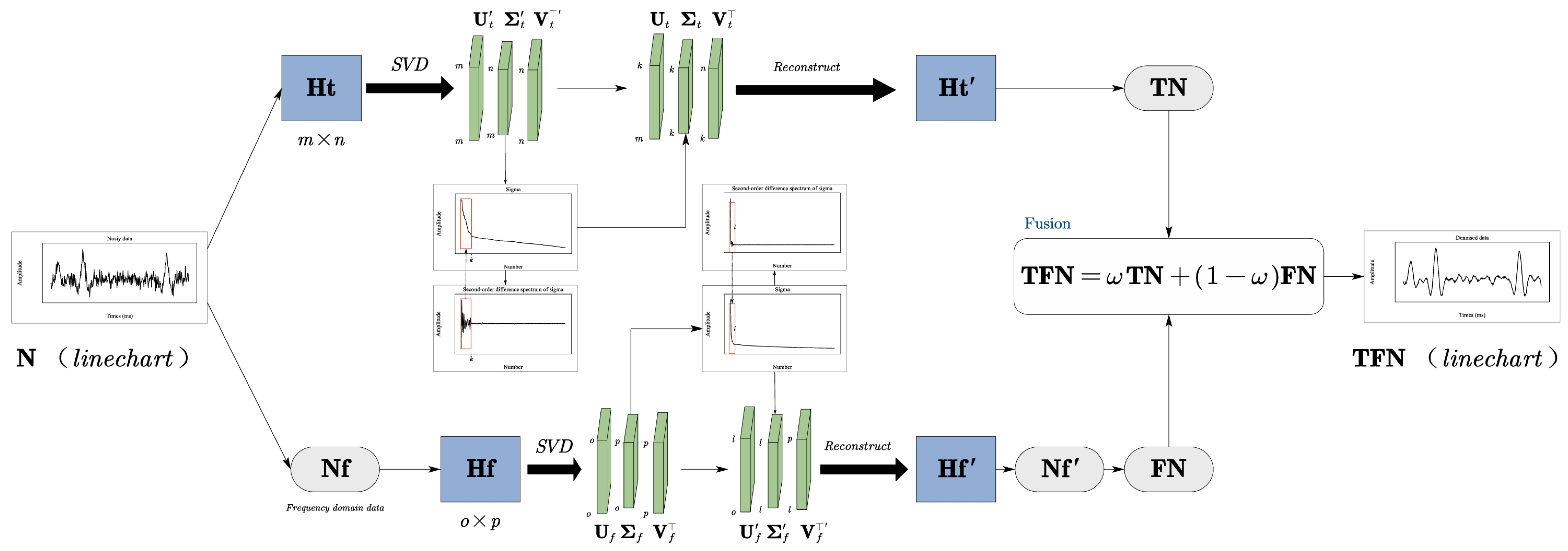 Figure 1. The overall structure of ASTF. It is divided into upper and lower parts. The upper part is time domain adaptive SVD processing, which converts noisy data N into Hankel matrix Ht for SVD. Then, the corresponding singular values in the red box are selected to reconstruct the matrix Ht′ according to the singular value second-order difference spectrum. Finally, the time domain denoised data TN is obtained. The lower part is the frequency domain adaptive SVD, which converts N into frequency domain data Nf. Hf, Hf′ and FN are similar to Ht, Ht′ and TN in time domain processing. The final denoised result TFN is obtained by fusing TN and FN.