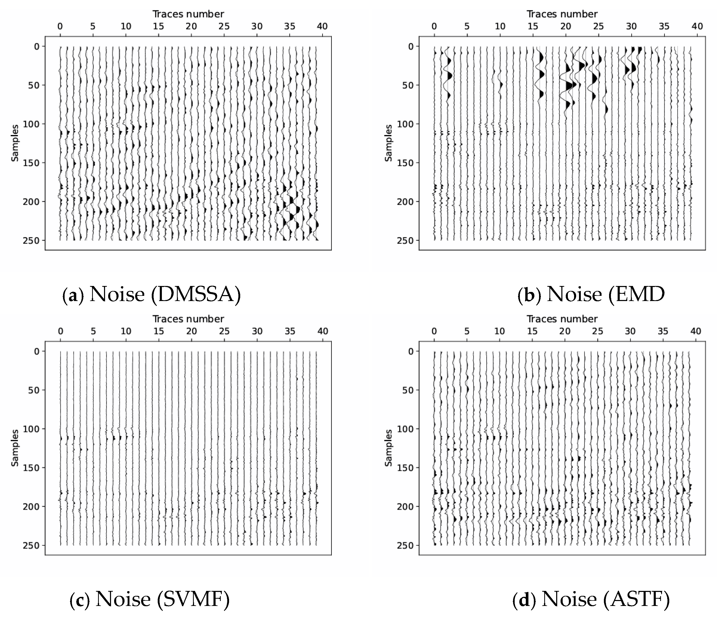 Figure 10. (a) Noise suppressed by DMSSA, (b) noise suppressed by EMD, (c) noise suppressed by SVMF and (d) noise suppressed by ASTF.