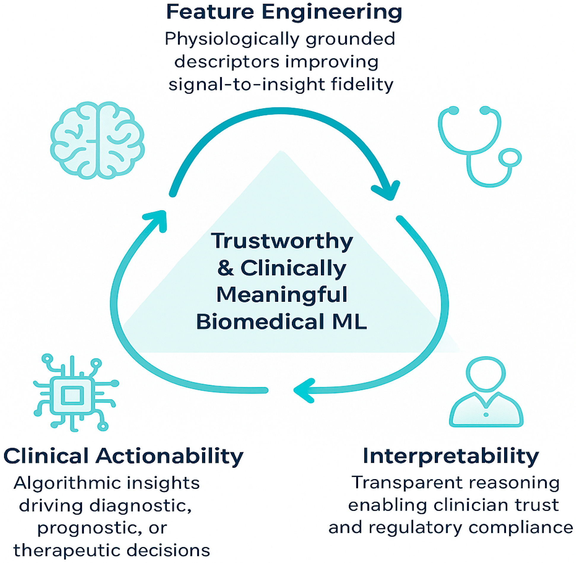 This review puts forth a unifying thesis: trustworthy and clinically meaningful biomedical ML results from the synergistic integration of three interdependent pillars feature engineering, model interpretability, and clinical actionability. Rather than being independent components, these elements are part of a closed feedback loop in which insights gained in one domain continuously feed back into and refine others.