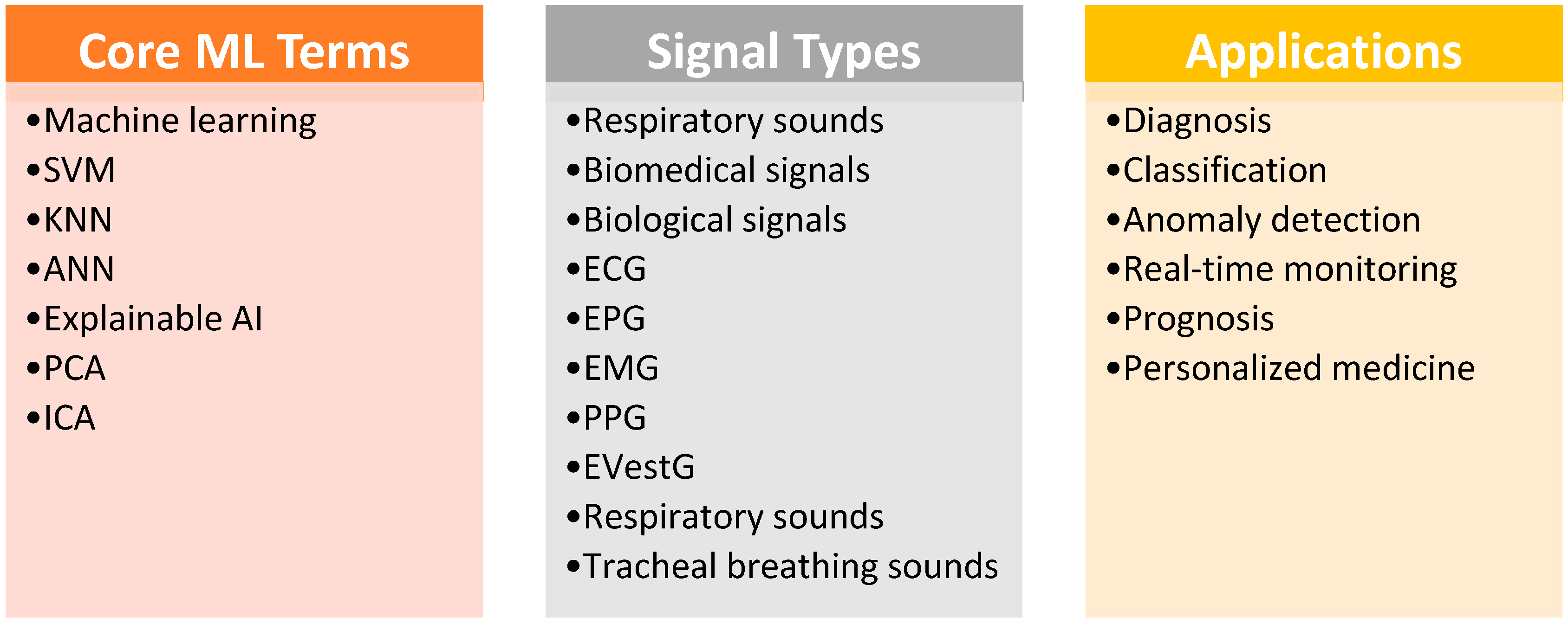 • An example of a search query combining these keywords is: (“machine learning” OR “ML”) AND (“biomedical signals” OR “physiological signals” OR “Biomedical signals” OR “respiratory sounds”) AND (“diagnosis” OR “classification”).