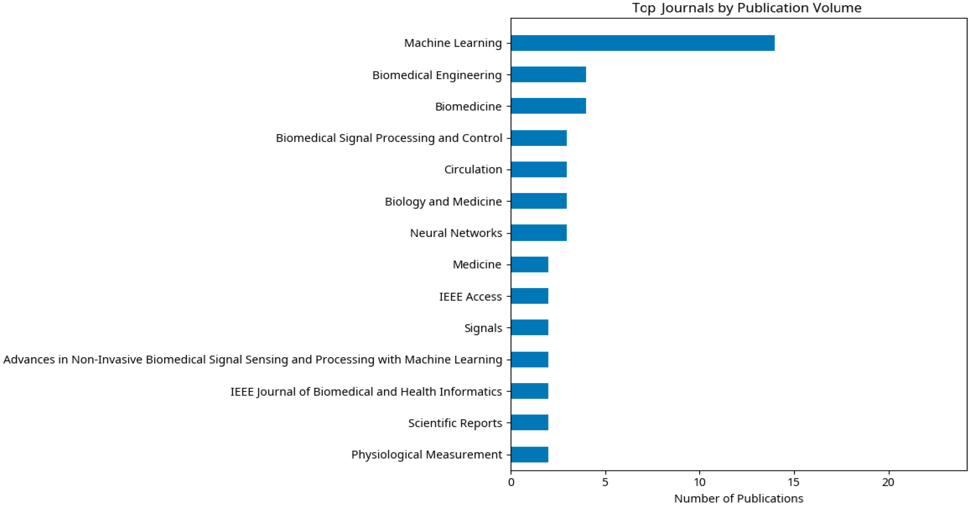 The analysis of publication years reveals the growth trajectory of research in this domain. As shown in Figure 5, publications on traditional machine learning for biomedical signals have shown a consistent upward trend, indicating increasing academic interest and research activity over the years.
