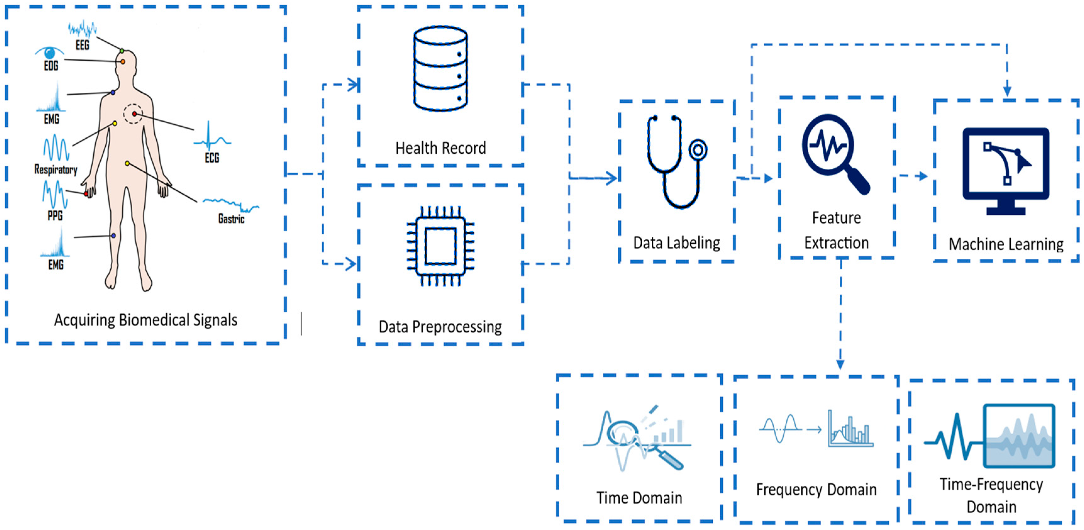 Biomedical signals are inherently complex, non-stationary, and often noisy. Therefore, a variety of signal processing techniques are employed to derive features that represent different aspects of the signal. These techniques can be broadly categorized into time-domain, frequency-domain, and time-frequency-domain methods.