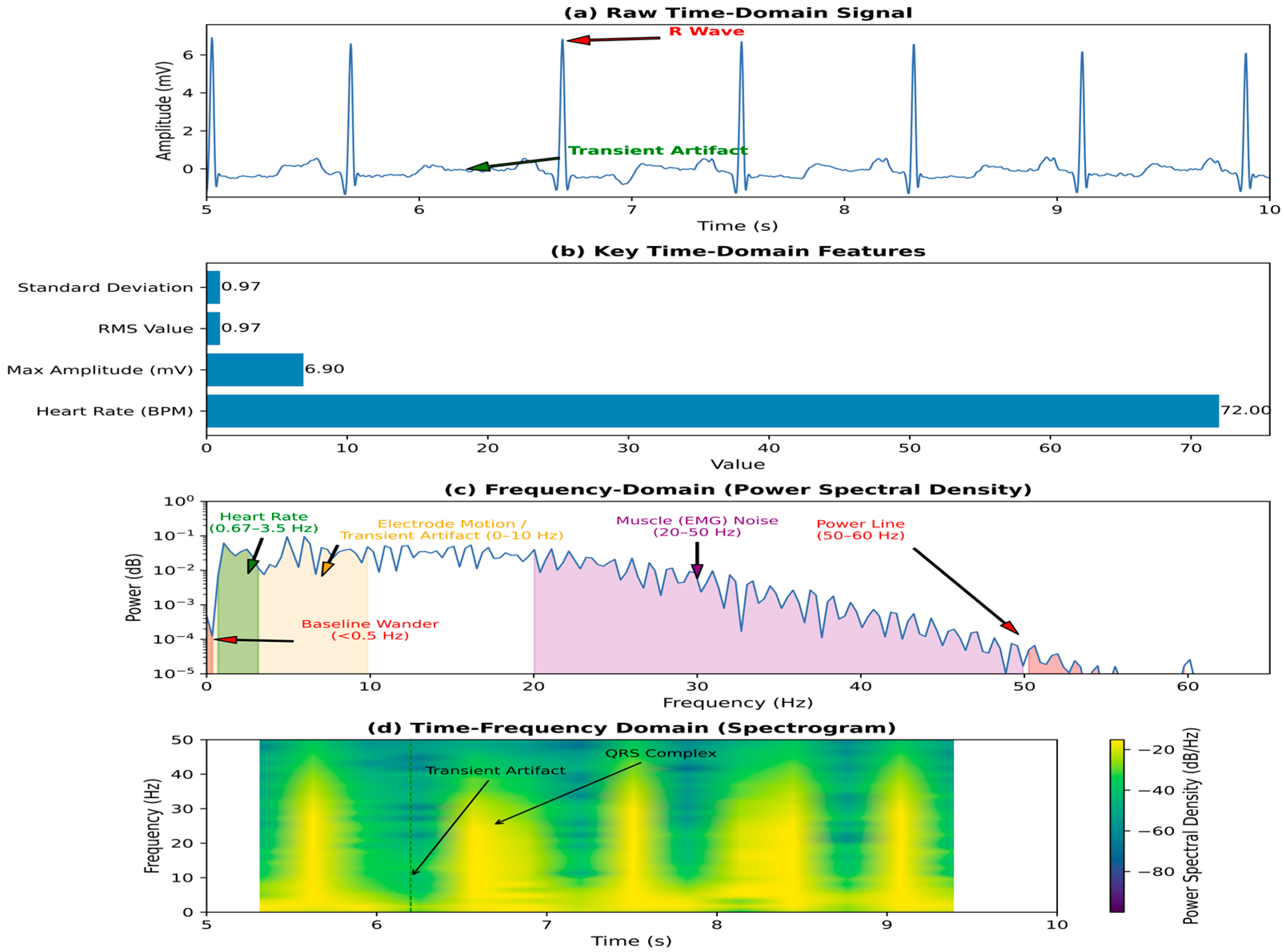 Frequency-DomainPSD, Spectral Centroid, Band Power Ratios, MFCCsQuantifies oscillatory patterns and energy distributionEEG (brain waves), respiratory sound wheeze/crackle detection, HRV analysis