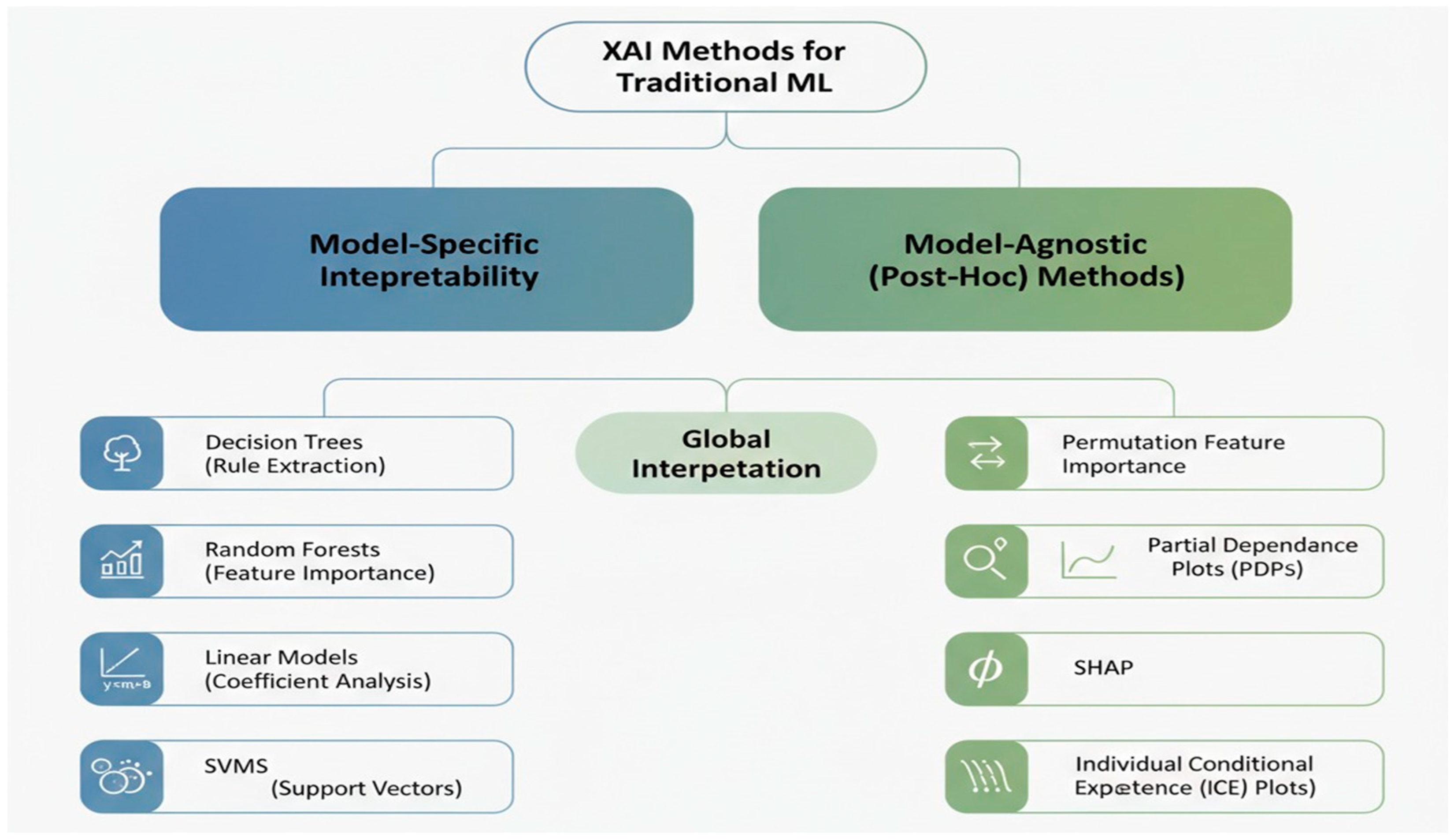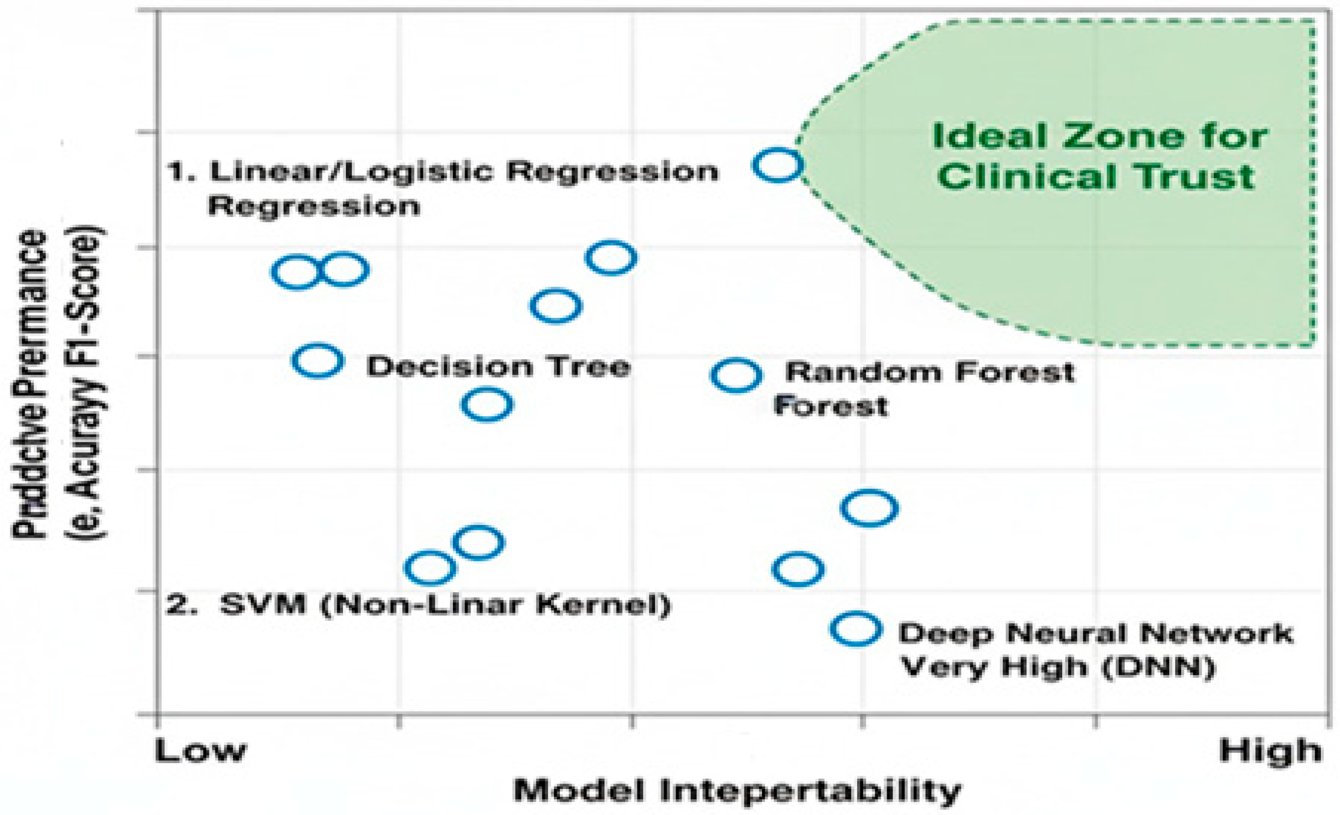 The most significant advantage of traditional ML models is their inherent interpretability, a non-negotiable requirement in high-stakes clinical decision-making. Healthcare professionals must understand the reasoning behind a model’s prediction to trust it and incorporate it into patient care [6]. Models like Decision Trees provide explicit decision rules, and Logistic Regression offers apparent feature coefficients indicating the direction and strength of each feature’s influence [7,8]. This transparency allows clinicians to validate the model’s logic against their medical knowledge. In contrast, the “black-box” nature of deep neural networks obscures the decision pathway, posing a significant barrier to clinical adoption and raising ethical concerns [9,10].