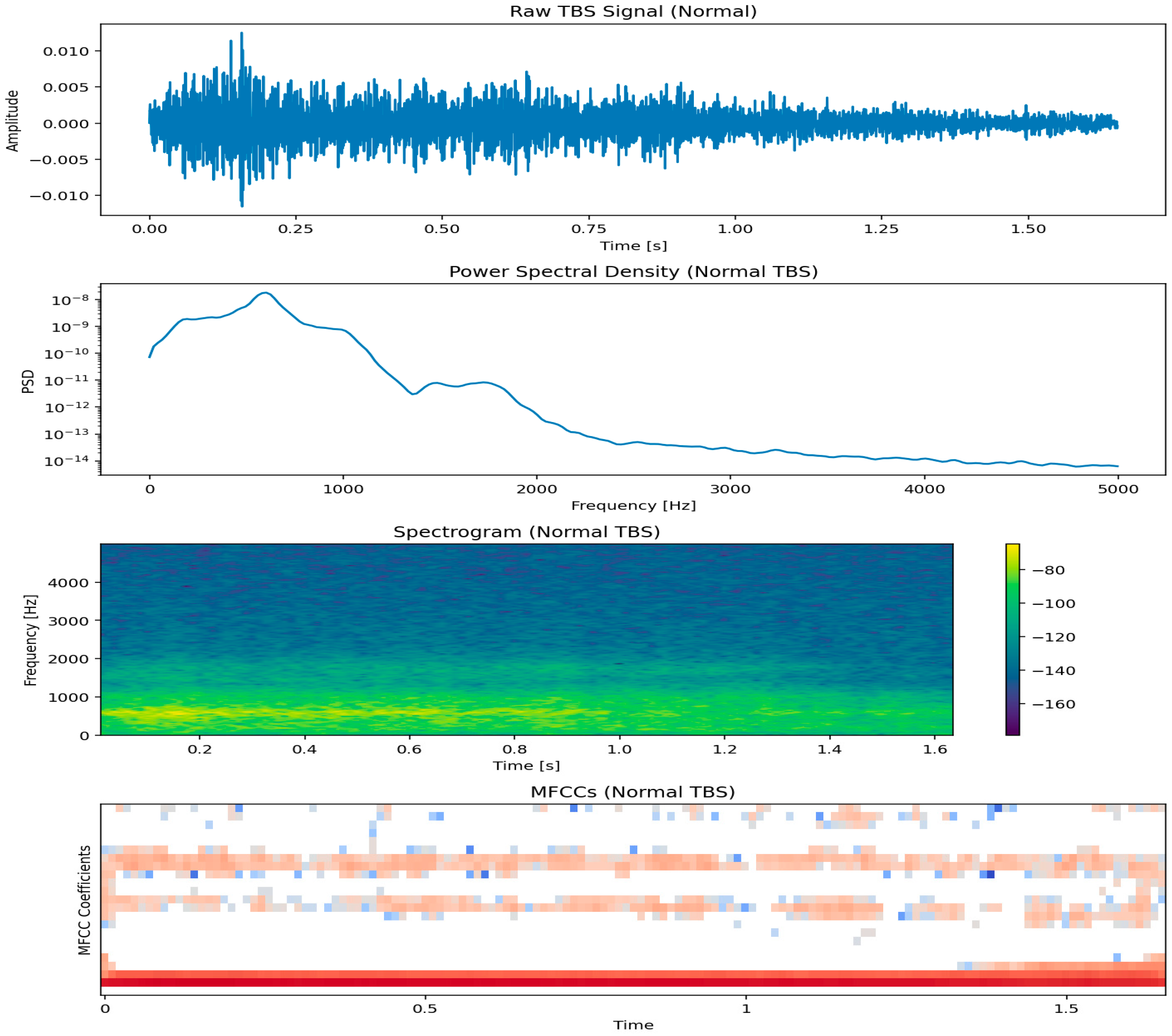 Time-DomainRMS, Mean, Zero-Crossing Rate, P-wave duration, QRS widthReflects amplitude, rhythm, and morphology of physiological eventsECG arrhythmia detection, EMG muscle activation, TBS airflow intensity