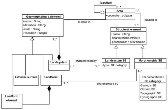 Figure 1 displays the proposed conceptual model, using a UML class model convention [26]. In this model, a Geomorphologic element is a generic concept which captures the common properties of landsystems, landforms, leftover surfaces and landform elements. Therefore, there are inheritance relationships (arrows with a triangle) between these concepts and the concept Geomorphologic element. These elements, being specializations of Geomorphologic element, inherit the relationship located-in with the Area concept. This relationship denotes that each landsystem, landform, landform element and leftover surface is associated with specific areas. Moreover, the aggregation relation (relation with a diamond and denoted [partition]) between areas indicates that the division of the geographic space in these areas forms a spatial partition. This hierarchical representation of regions, defined by various types of geomorphological elements, introduces into the model a set of geomorphological components distributed across distinct levels of granularity.