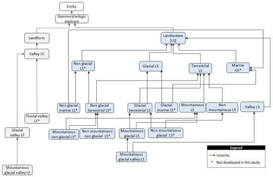 Considering the inheritance of landsystems, we see that Mountainous glacial valley LS inherits from Mountainous glacial LS and Valley LS. Mountainous glacial LS inherits from Mountainous LS and Glacial terrestrial LS while Valley LS inherits from Terrestrial LS. Moreover, Mountainous LS inherits from Terrestrial LS, while Glacial terrestrial LS inherits from Glacial LS and Terrestrial LS. Considering the landform inheritance, Valley LF inherits from Landform. Then, both Fluvial valley LF and Glacial valley LF inherit from Valley LF. Finally, Mountainous glacial valley LF, the landform relevant to our case study, inherits from Glacial valley LF.