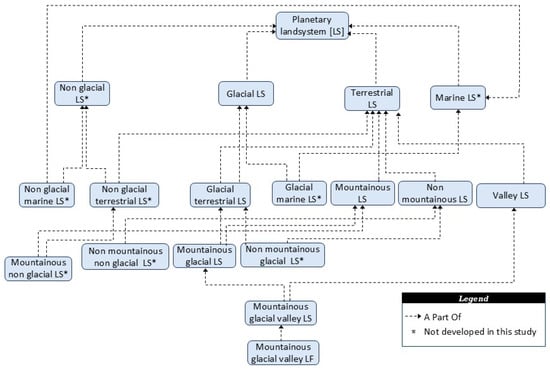 Looking at the bottom of the hierarchy in Figure 3, a Mountainous glacial valley LF is part-of a Mountainous glacial valley LS. Mountainous glacial valley LS is part-of a Mountainous glacial LS. A Mountainous glacial LS is defined as a landsystem located in a rugged glacial region having a higher altitude relative to the surrounding regions. Hence, a Mountainous glacial LS is part-of both Mountainous LS and Glacial terrestrial LS. A Glacial terrestrial LS is a landsystem defined by a region of the emerged Earth surface that has been glaciated in the past or is glaciated today. Moreover, a Mountainous LS is part-of a Terrestrial LS and a Glacial terrestrial LS is part-of both a Glacial LS and Terrestrial LS. A Glacial LS is a landsystem defined by a region of the Earth’s surface that has been glaciated in the past or is glaciated today and a Terrestrial LS is a landsystem defined by an area of emerged earth (continent, island, etc.).
