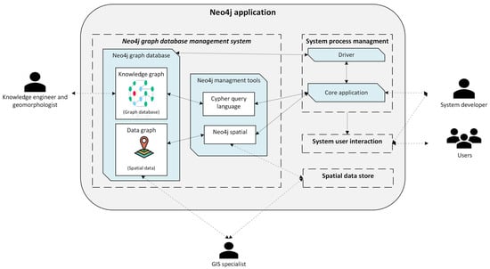 The system process management (right dashed rectangle in Figure 5) constitutes the heart of the system. The core application (blue trimmed-corner rectangle) is the program developed by the system developer to control the whole system. The core application can connect to the Neo4j graph database thanks to the Neo4j driver. The connection to the driver enables the system to perform queries on the knowledge base and on the spatial database, using, respectively, the Cypher and Neo4j spatial management tools mentioned above.
