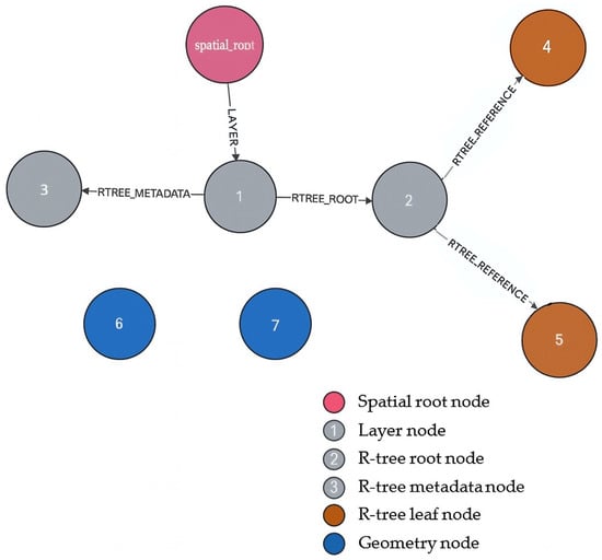 An example of a spatial layer is a set of polygons representing landmasses. The set of polygons can be delimited by a minimal rectangle (a bounding box) stored in the root node (node 2 in Figure 6) of the R-tree. Each spatial entity of landmasses is represented by a polygon of land which has its own bounding box. Each bounding box (rectangle represented by capital letter in Figure 7) is stored in a reference node (brown node in Figure 6) as an R-tree leaf node. In the simple example of Figure 6, there are only two polygons (nodes 6 and 7) and the hierarchy corresponds to nodes 2, 4 and 5. The geometry of each polygon is stored in another node (blue node). The identifier id of the geometry node of each polygon is stored as an attribute in the relevant R-tree leaf node that contains the bounding box of the geometry.