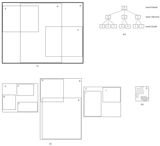 Representation of an R-tree: (i) Bounding box in level 0, (ii) Bounding boxes in level 1, (iii) Illustration of geometries in a bounding box D, (iv) Hierarchy level in an R-treeix Hierarchy level in an R-tree.