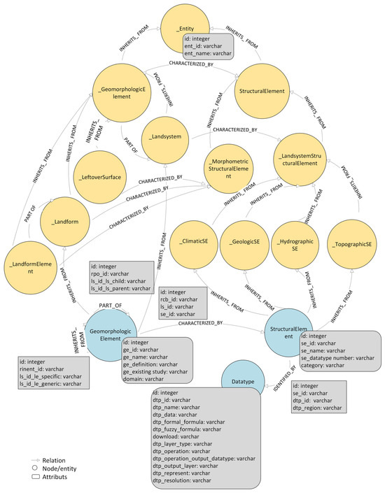 The third level of nodes and edges contains instances of geomorphologic elements and instances of structural elements. These instances can be located in one or several areas in the geographic space. An object or element that represents a specific location or area in a model is called a spatial entity [29]. The area, or spatial characteristics of spatial entities, is defined by the geometry of spatial data in a GIS. As mentioned in Section 4, Neo4j offers no direct access to geometry. Instead, it is accessed using the R-tree through the Layer node. Thus, the areas of our conceptual model are not defined by nodes, but rather by spatial layers and the geometry of a structural element is obtained (computed) through the datatype node. Hence, we chose to connect a Datatype node to a Structural element node and to a Layer node, knowing that a Layer node is a representative of a Neo4j spatial layer. The edge between the Datatype and the StructuralElement nodes contains the properties used to extract the areas from the GIS data and to transfer it in the layer. For example, if the data file is a polygon shapefile, a property can indicate which parts of the polygons are structural elements. This representation allows for a structural element to be associated with different data files. A data file can be associated with several structural elements as well. Thus, instances of a structural element are located by defined geometries of the collection of spatial entities related to the Layer node. Such geometries are identified by Neo4j from the above-mentioned properties (structural element–datatype) through the R-tree index.