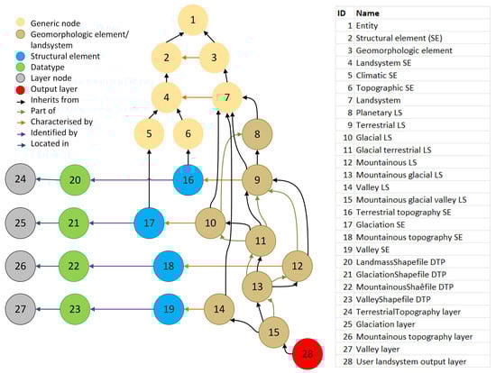 The process of instantiation is performed systematically in three steps. First, a query retrieves in the second level all the nodes of the structural elements that characterize the requested landsystem. This query is performed by going upwards through the landsystem hierarchy. Second, instances of all these structural elements are inferred from the related datatypes (Figure 8). For example, in Figure 9, the glaciation structural element (node 17) is connected to a shapefile datatype (node 21): an instance of a glaciation structural element can be inferred from such a shapefile datatype. Third, for each datatype, a layer is linked to the datatype. The resulting nodes and edges are added to the graph, enhancing the data level.