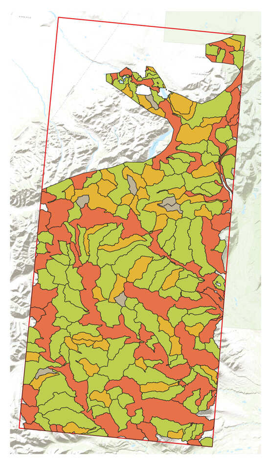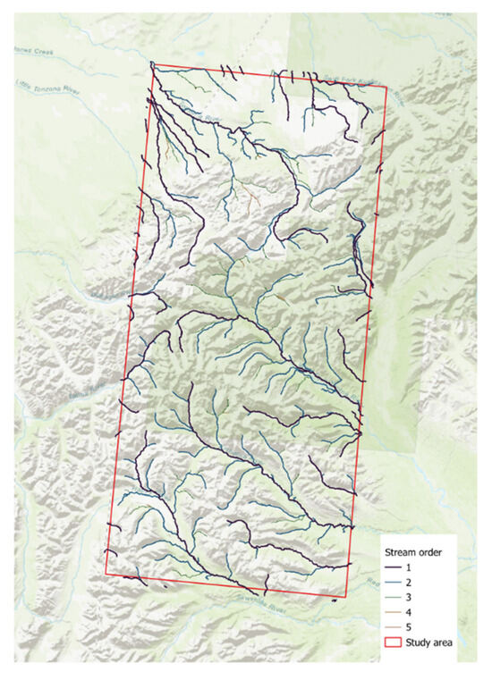 Hack’s order represents the hierarchical relationship between stream segments based on their discharge [36]. It is determined by assigning an order of 1 to the main channel, then incrementing the order by one for each tributary that discharges into a stream of a given order. Hence, all streams discharging in the mainstream are assigned an order of 2, and so on. For our study area, Figure 11 displays the hydrographic network ordered using Hack’s method with an order scale from 1 to 5.