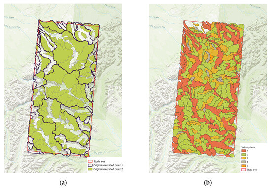 (a) Order 1 watersheds (black-bounded surfaces) and order 2 watersheds (green surfaces)—(b) instances of the valley landsystem (colored surfaces).