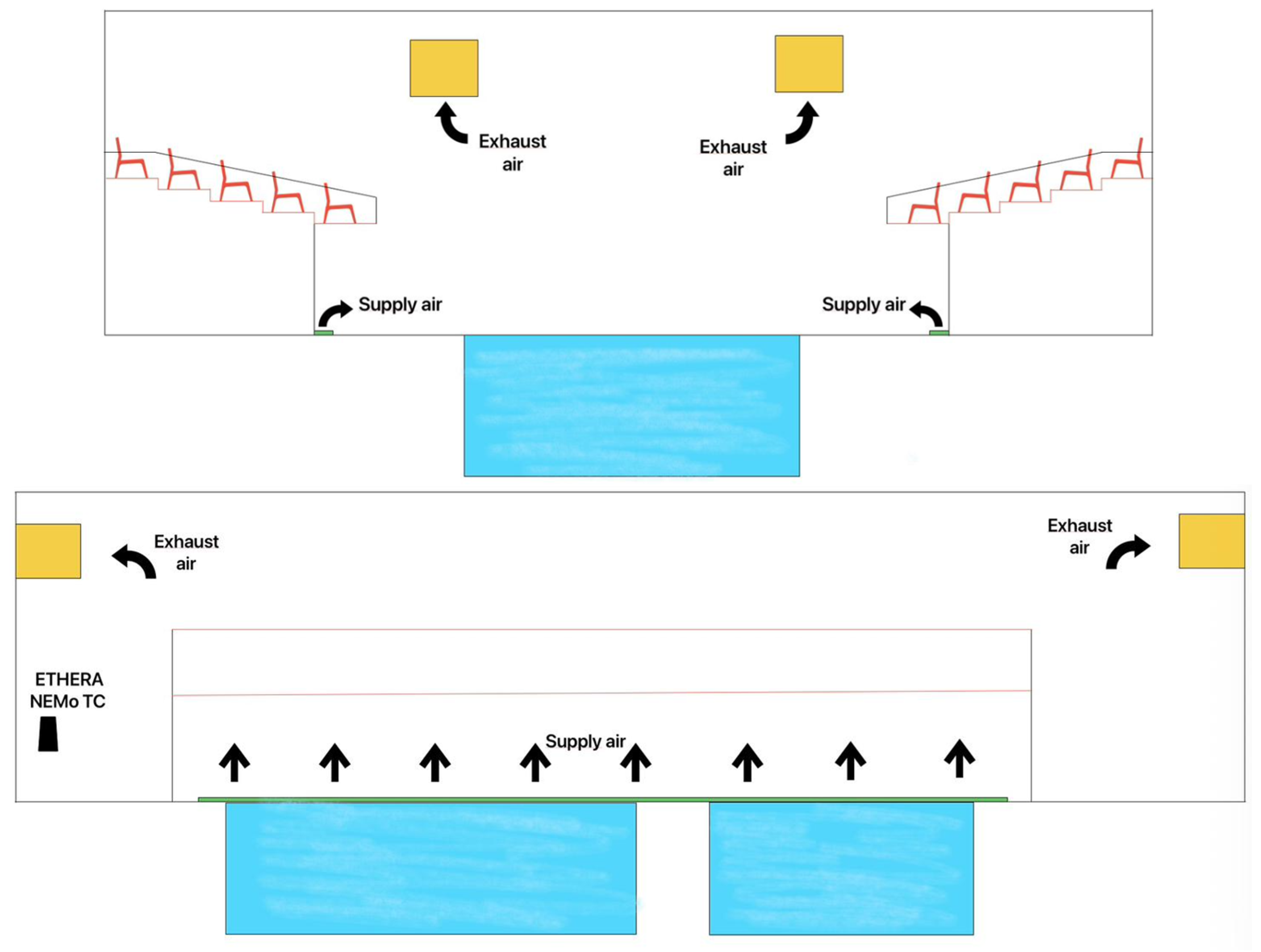 In the cited studies, air was supplied from the top and exhausted near the floor. In the present research, the system differs—supply air is introduced in the lower part of the pool area and exhausted through corner grilles. This configuration changes the airflow pattern and NCl3 transport, promoting mixing in the lower zone. Such differences in ventilation geometry should be considered when comparing results, as they directly affect contaminant dispersion and removal efficiency.