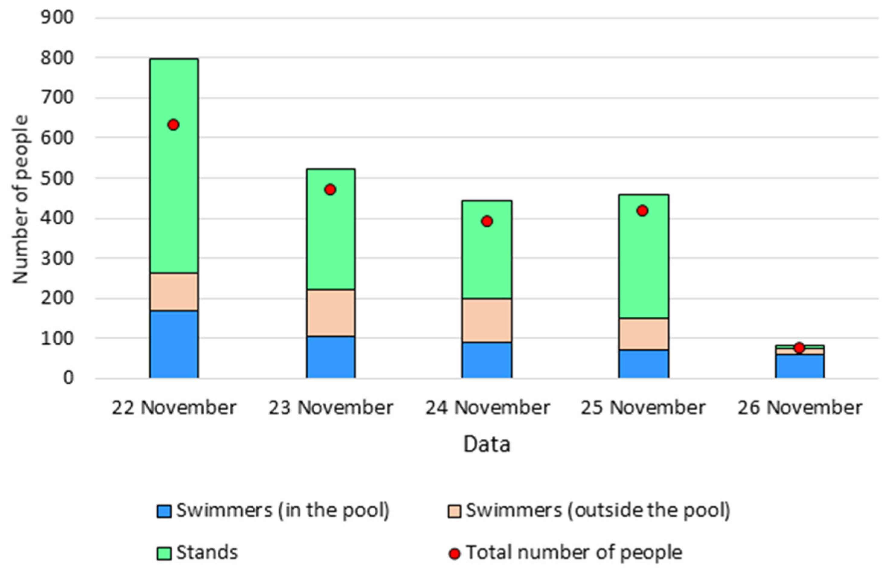 Figure 2). The highest number occurred on 22 November, with a maximum of 170 people in the water; there was an average of 89 people in the water, 53 near the pool basins, and 181 in the stands. On the remaining days, the number of swimmers ranged from 37 to 46, with 11 to 71 people near the pool area. The maximum total number of people present in the facility during the study period was 632. On 26 November, a decrease was observed, with an average of only 52 people in the entire facility. The difference between the days results from the normal operating mode.