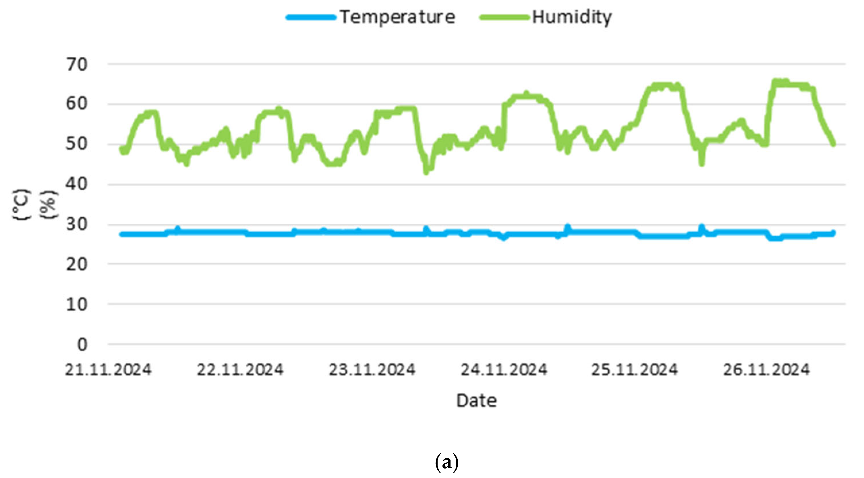 On 22 November, a distinct increase was observed in all air quality parameters associated with user activity. The air temperature ranged from 27.5 °C to 29.0 °C, with a daily mean of 27.7 °C. Relative humidity varied between 45% and 58%, averaging approximately 52%. The mean carbon dioxide (CO2) concentration was about 640 ppm, within a range of 515–898 ppm, representing the highest level recorded during the observation period.